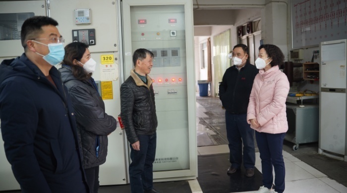 杨兰英(右一)向主校区高压电室工作人员了解有关工作运行情况 罗嘉怡/摄