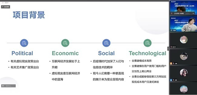 邹正宇团队由2020级网络与新媒体一班学生邹正宇、财务管理一班学生宋翊纲、数据科学与大数据技术厚生班学生曾科和2021级工程造价三班学生赵美婷组成,在何昱、李成家两位老师指导下积极备赛,征得湖南美术馆同意和支持,通过VR全景展览技术,将该馆主办的湖南著名美术家钟增亚先生的“湖南著名美术家推介工程·钟增亚艺术展”进行了多角度、全景式呈现,受到评审专家的好评。