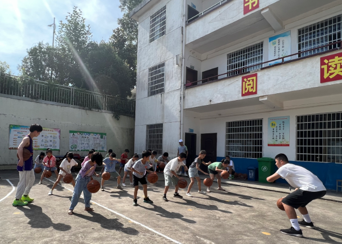 实践队队员教孩子们运球 佘毅/摄