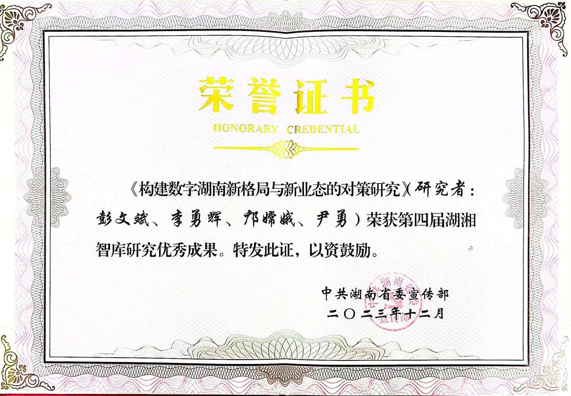 (本网讯)近日,第四届湖湘智库研究“十大金策”和优秀成果颁奖仪式及座谈会举行,为“十大金策”和优秀成果获奖代表颁奖。