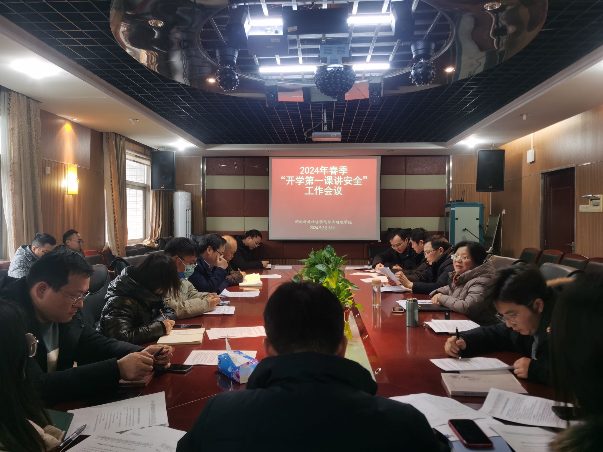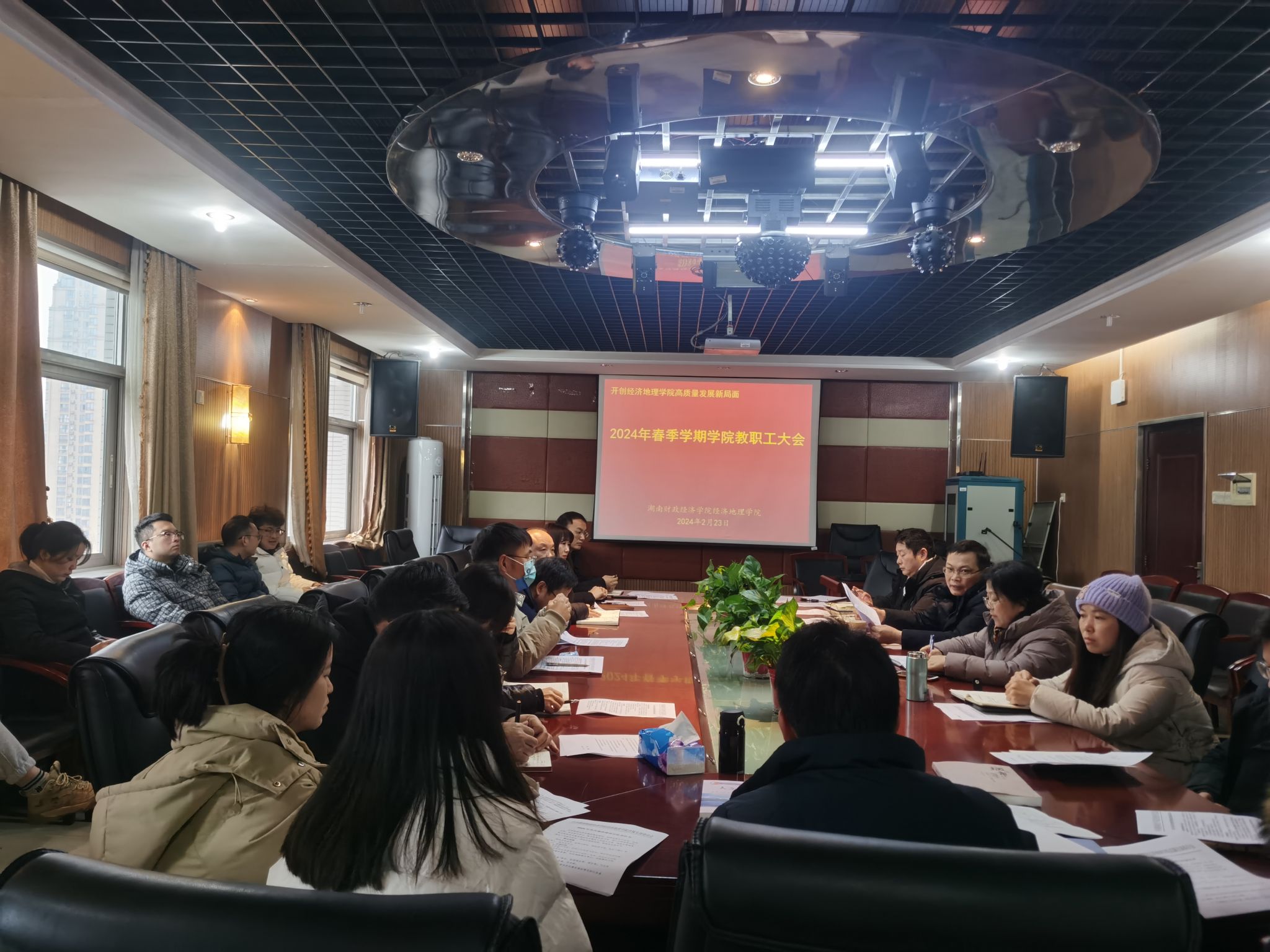 (本网讯)为全面贯彻学校关于加快建设财经特色鲜明的一流应用型本科教育精神,努力推动学院各项工作高质量发展,提高人才培养能力,形成更高水平的人才培养模式的办学方向,经济地理学院于2月23日在办公楼1014会议室召开2024年春季学期教职工大会。会议由院长彭文斌主持,全院教职工参加会议。