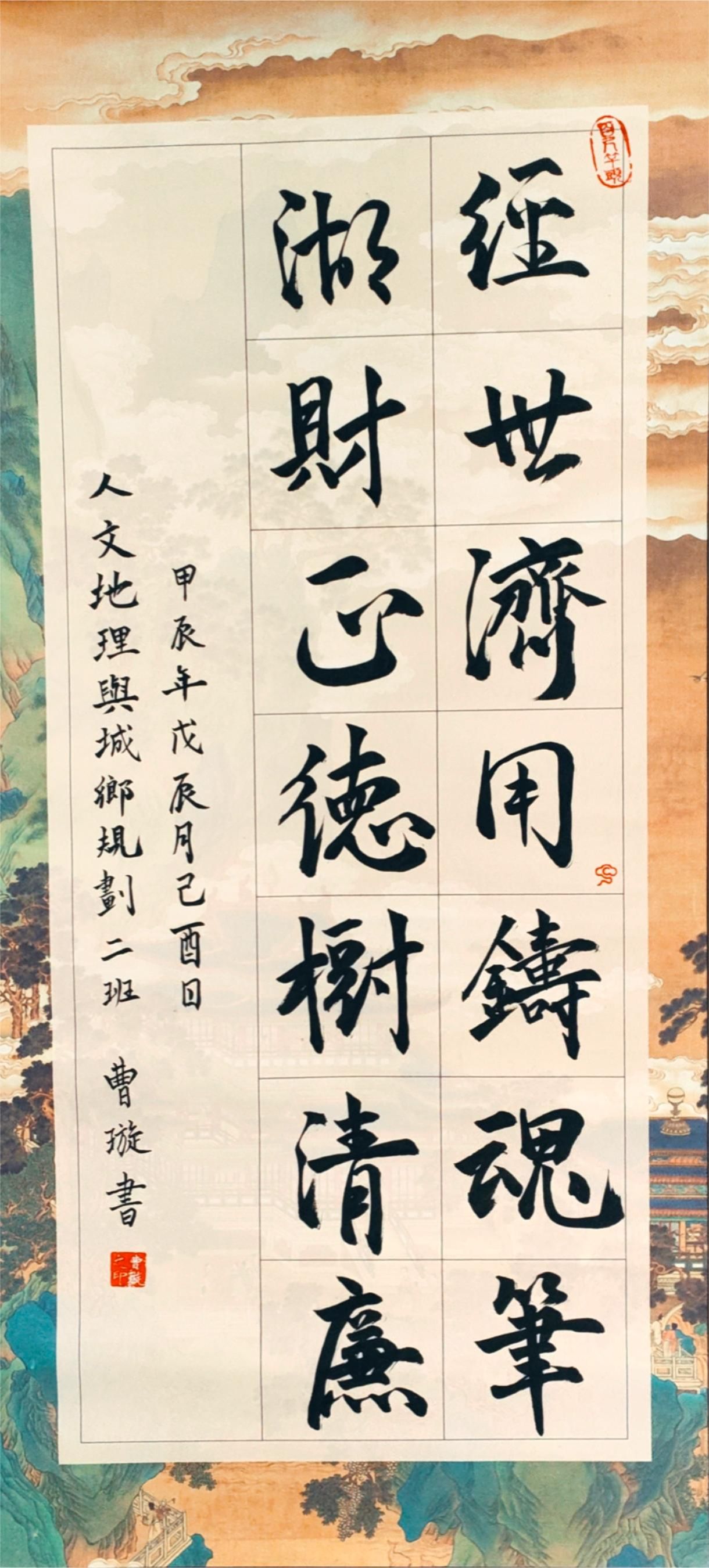团学两会负责部门成员对作品进行初步筛选,再由学院领导、老师组成评委,从内容创意、主题把握、技法运用等方面对每幅作品进行打分,最终评选出了一、二、三等奖若干,并为获奖者颁发奖状。其中,22级人文地理与城乡规划二班曹璇凭借其深具感染力的书法作品《廉》荣获一等奖。