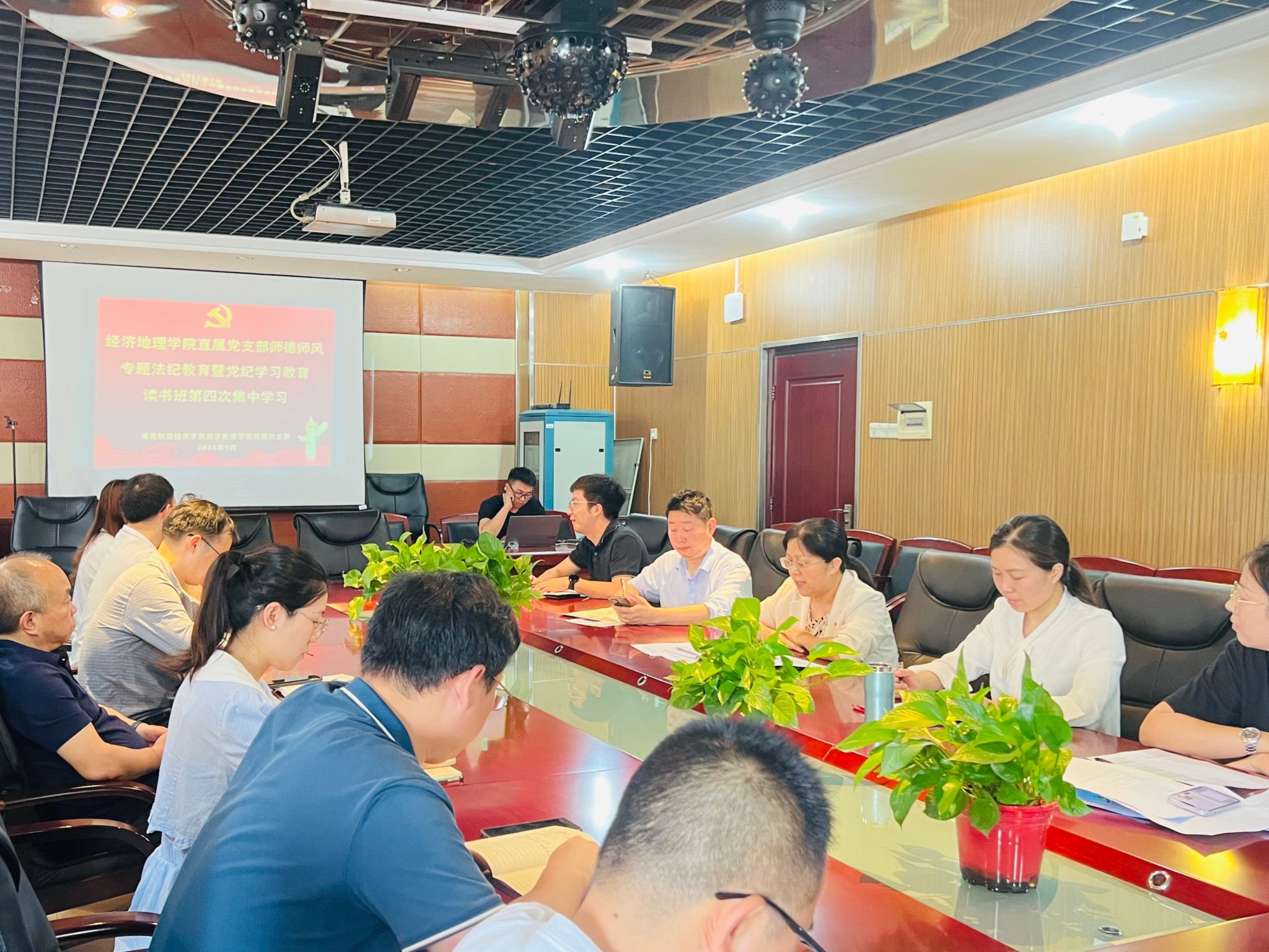 (本网讯)为贯彻落实全省加强师德师风建设以案促改工作推进会精神,进一步提升教师职业道德规范,增强法纪意识,结合大力开展的党纪学习教育,5月27日,经济地理学院组织全体教职工在行政楼1014会议室开展师德师风专题法纪教育集中学习,会议由院直属党支部书记姚旭辉主持。