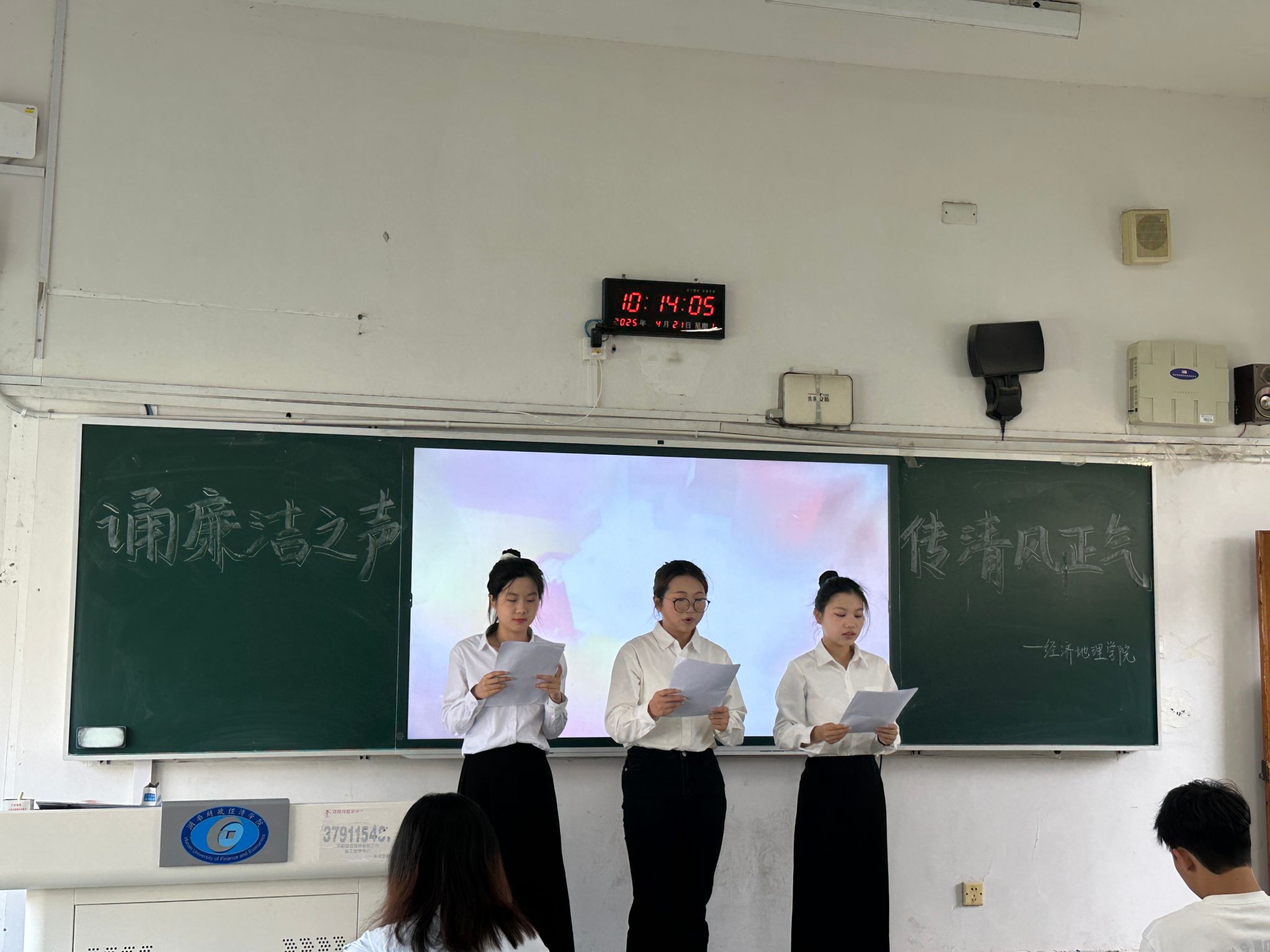 (本网讯)为进一步贯彻落实中央八项规定精神,把加强作风建设与弘扬廉洁文化贯通起来,充分发挥廉洁文化培根铸魂作用,扎实开展廉洁文化月活动,4月21日,经济地理学院在主校区2101教室举办了“诵廉洁之声,传清风正气”学生廉洁主题朗诵比赛,院党支部书记姚旭辉、副院长苏昌贵出席活动。