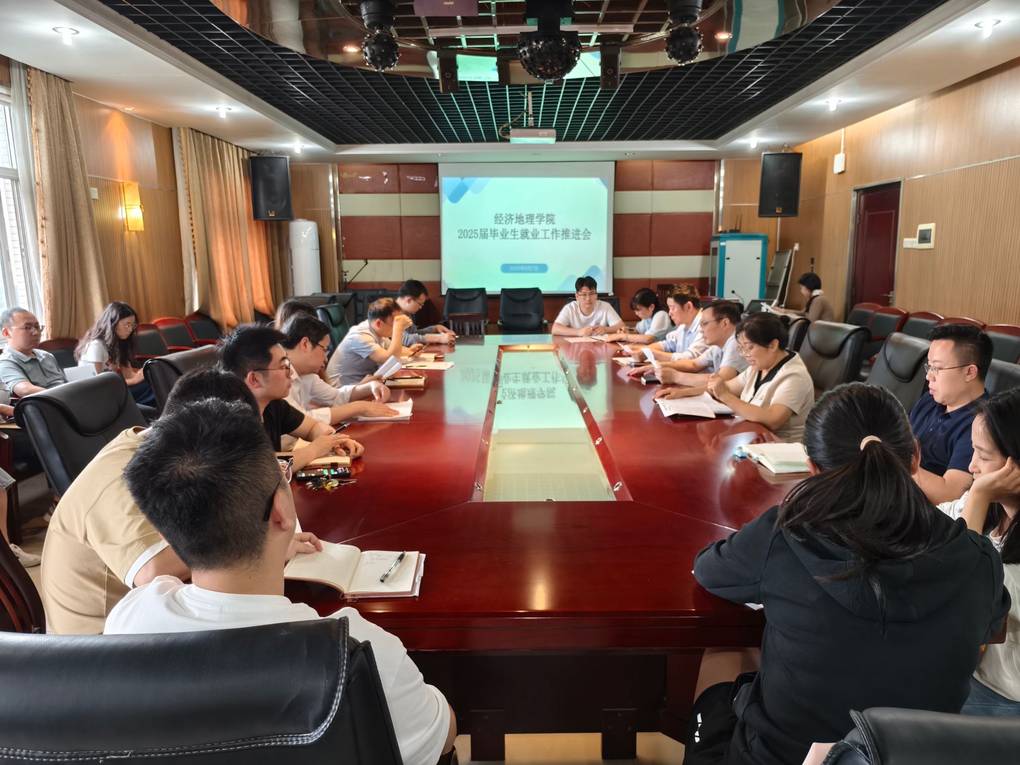 (本网讯)为进一步贯彻落实学校就业工作推进会精神,扎实做好毕业生就业工作,帮助毕业生实现更高质量更充分就业,5月7日下午,经济地理学院在办公楼1014会议室召开2025届毕业生就业工作推进会。学院领导班子成员、2025届毕业班辅导员和全院教师参加了此次推进会,会议由副院长苏昌贵主持。