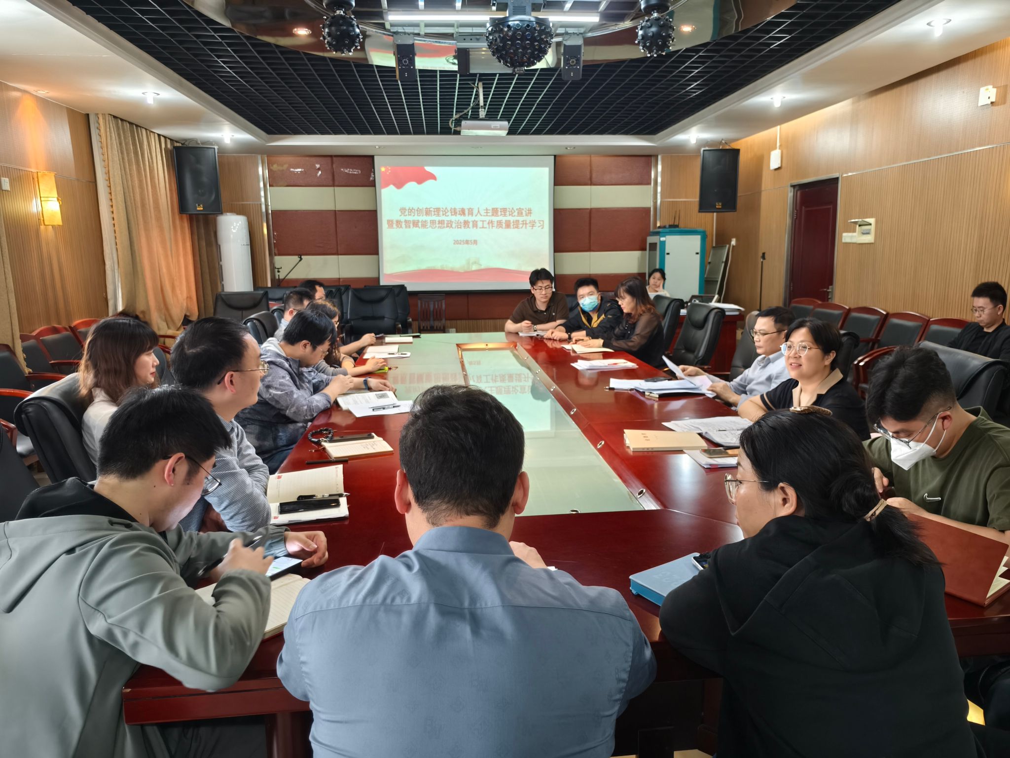 (本网讯)5月21日上午9点,经济地理学院在主校区办公楼1014会议室开展5月党的创新理论铸魂育人宣讲活动,会议主题为“数智赋能思想政治教育工作质量提升”。会议由院直属党支部书记姚旭辉主持,学院领导班子成员出席会议、全体教职工参加会议。
