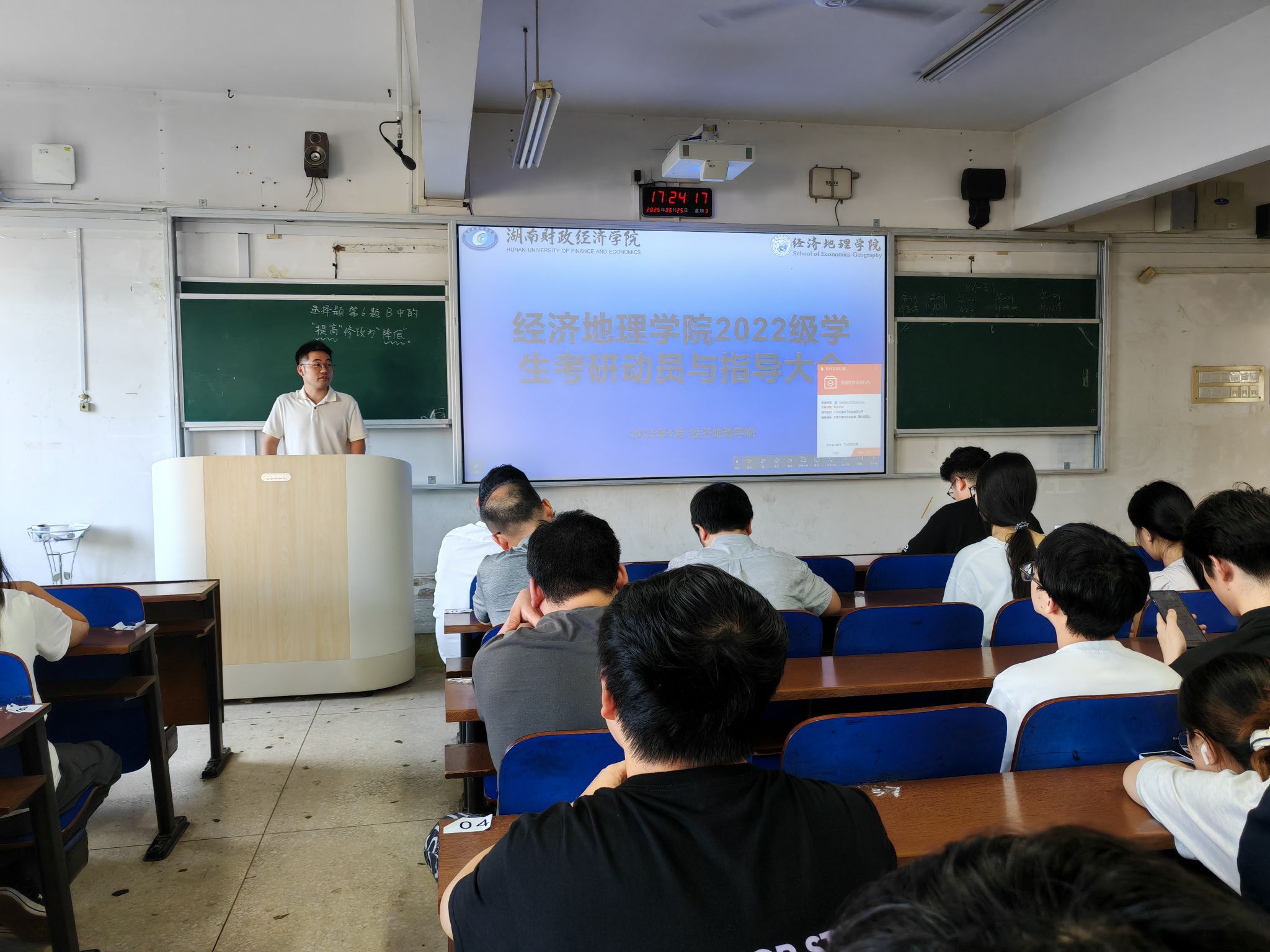 (本网讯)为助力2022级人文地理与城乡规划专业学生精准锚定就业方向,科学规划考研与考公路径,6月25日,经济地理学院在主校区3208教室隆重召开2022级就业动员与考研指导大会。院长彭文斌、院直属党支部书记书记姚旭辉、副院长苏昌贵、学工办主任刘娟、团总支书记刘权以及人文地理与城乡规划系全体教师齐聚一堂,为学生们带来极具针对性的指导与建议。