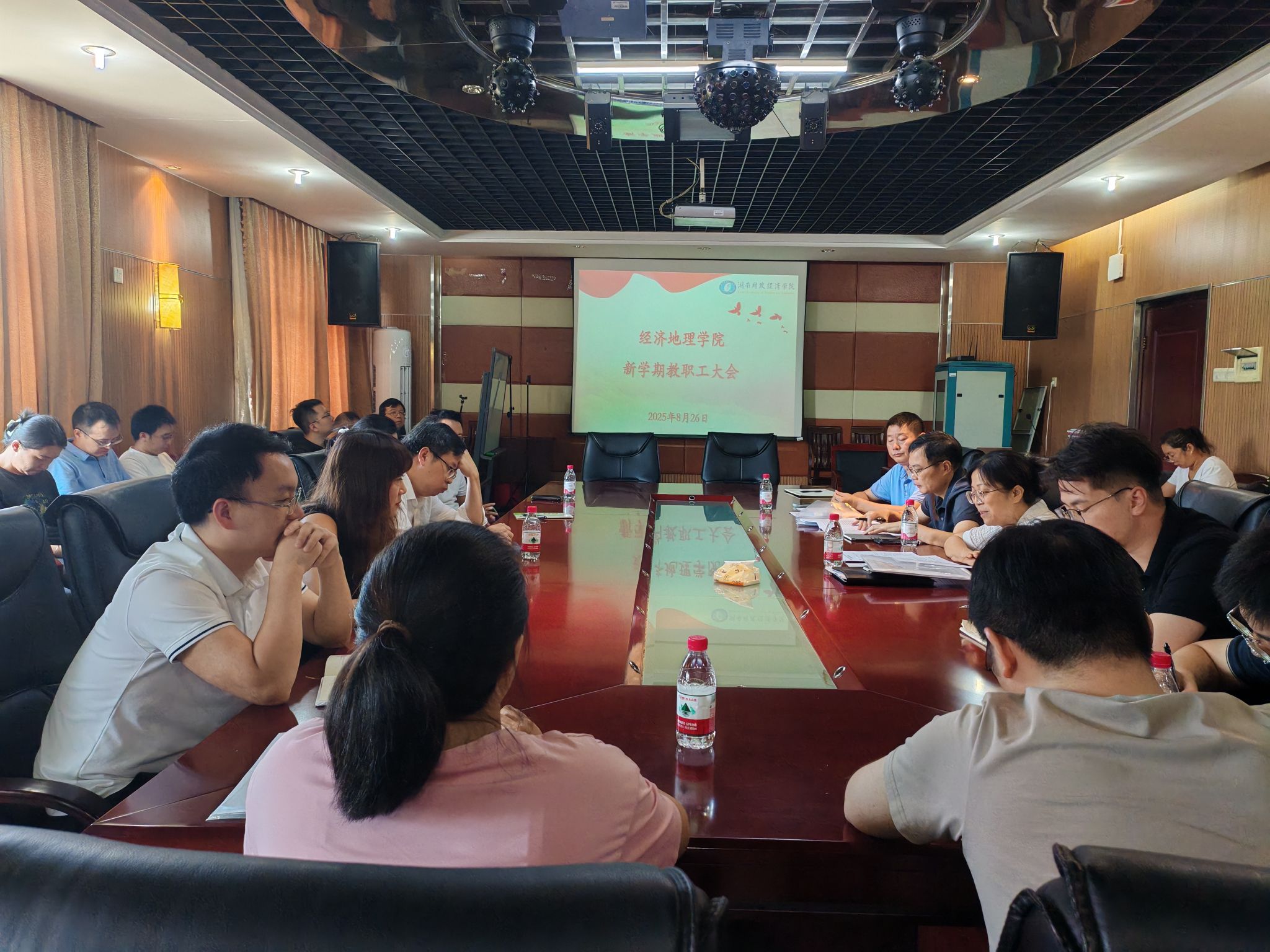 (本网讯)8月25日,经济地理学院在主校区行政楼1014会议室隆重召开全院教职工大会,为新学期学院工作谋篇布局。会议由副院长(副所长)苏昌贵主持,院直属党支部书记姚旭辉、院长彭文斌和全体教职工参加。