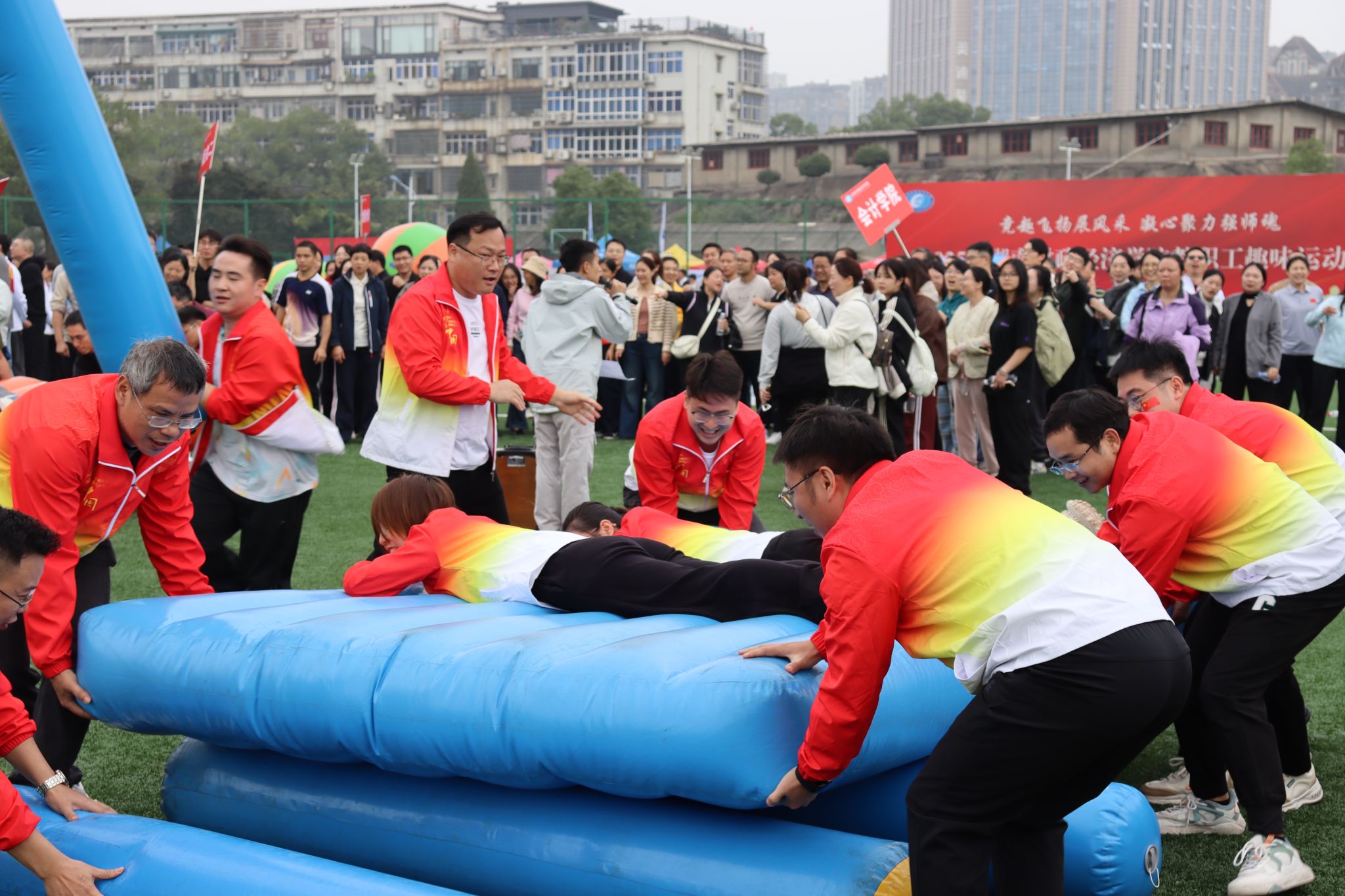 此次趣味运动会集竞技性、趣味性和协作性于一体,设置了“鸿运当头”“车轮滚滚”“薪火相传”“迎面接力”四个团体项目。平日里辛勤耕耘于三尺讲台的老师们,今日化身“运动好手”,铆足干劲、奋勇拼搏,展开了一场速度与激情的较量、智慧与力量的角逐,成为赛场上一道亮丽的风景线。比赛现场气氛紧张而热烈,每位参赛选手脸上都洋溢着喜悦之情,现场加油声、欢呼声此起彼伏,将比赛氛围一次次推向高潮。