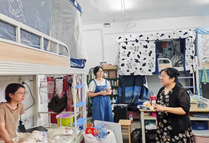 (本网讯)9月5日下午,院直属党支部书记姚旭辉、学工办主任刘娟下寝看望新搬寝学生,为同学们送上秋日第一份关怀与嘱托。