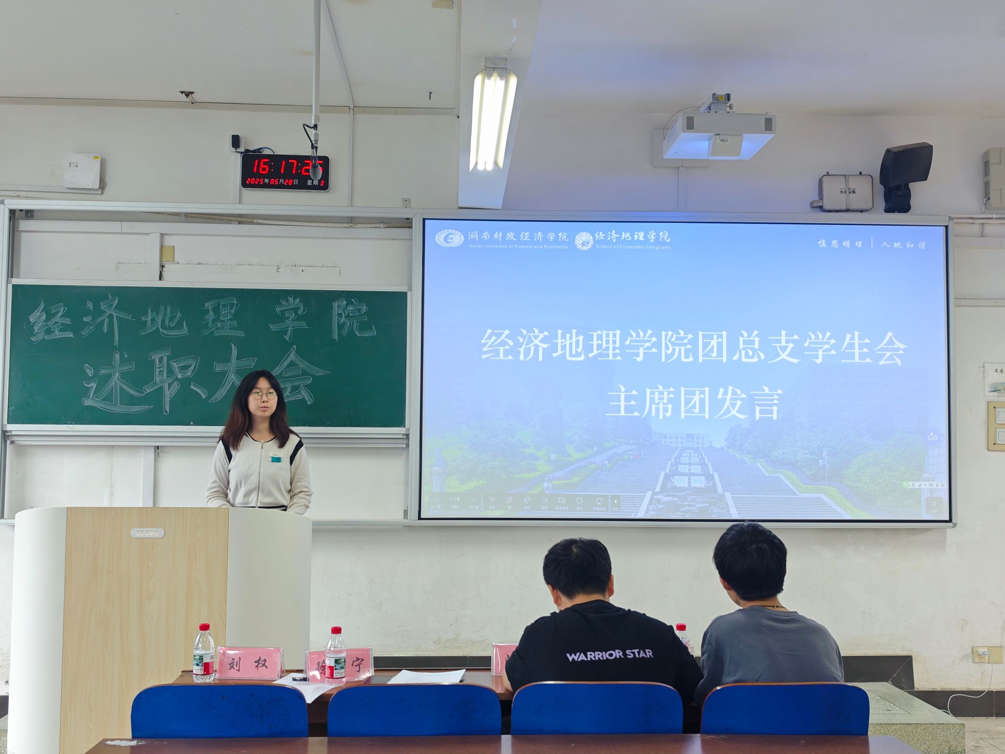 (本网讯)为全面总结学院2024-2025年度团学工作成果,提升团队协作能力,促进团学会各部门工作交流。5月28日,经济地理学院在主校区第三教学楼3404教室召开年度述职大会。院团总支书记刘权、团学会主席团成员及团学会各部门成员参会。