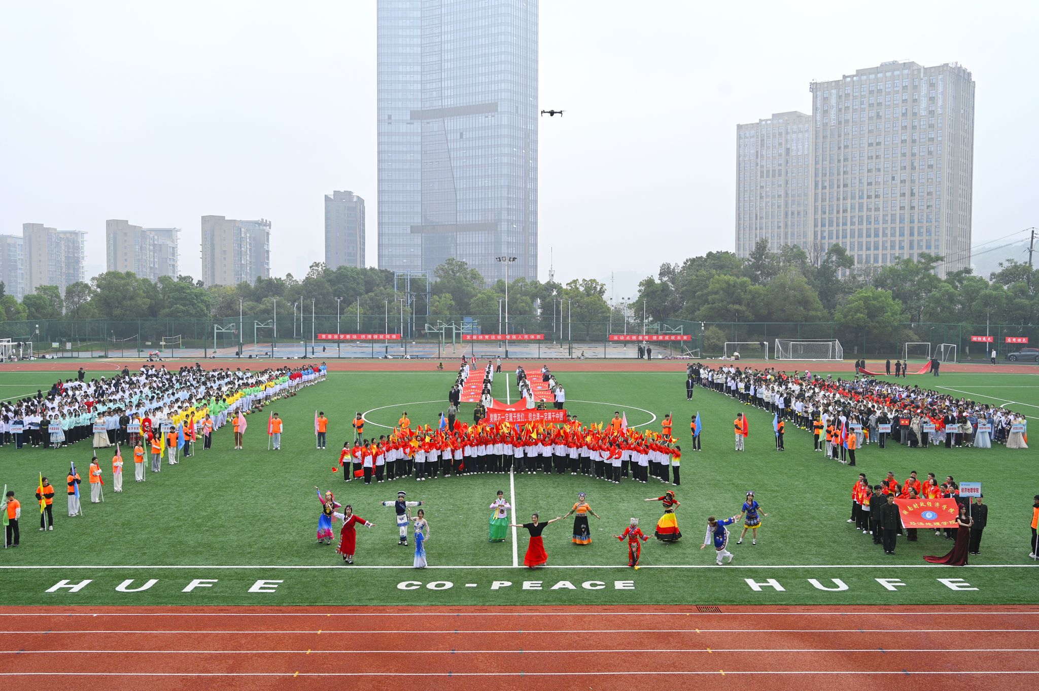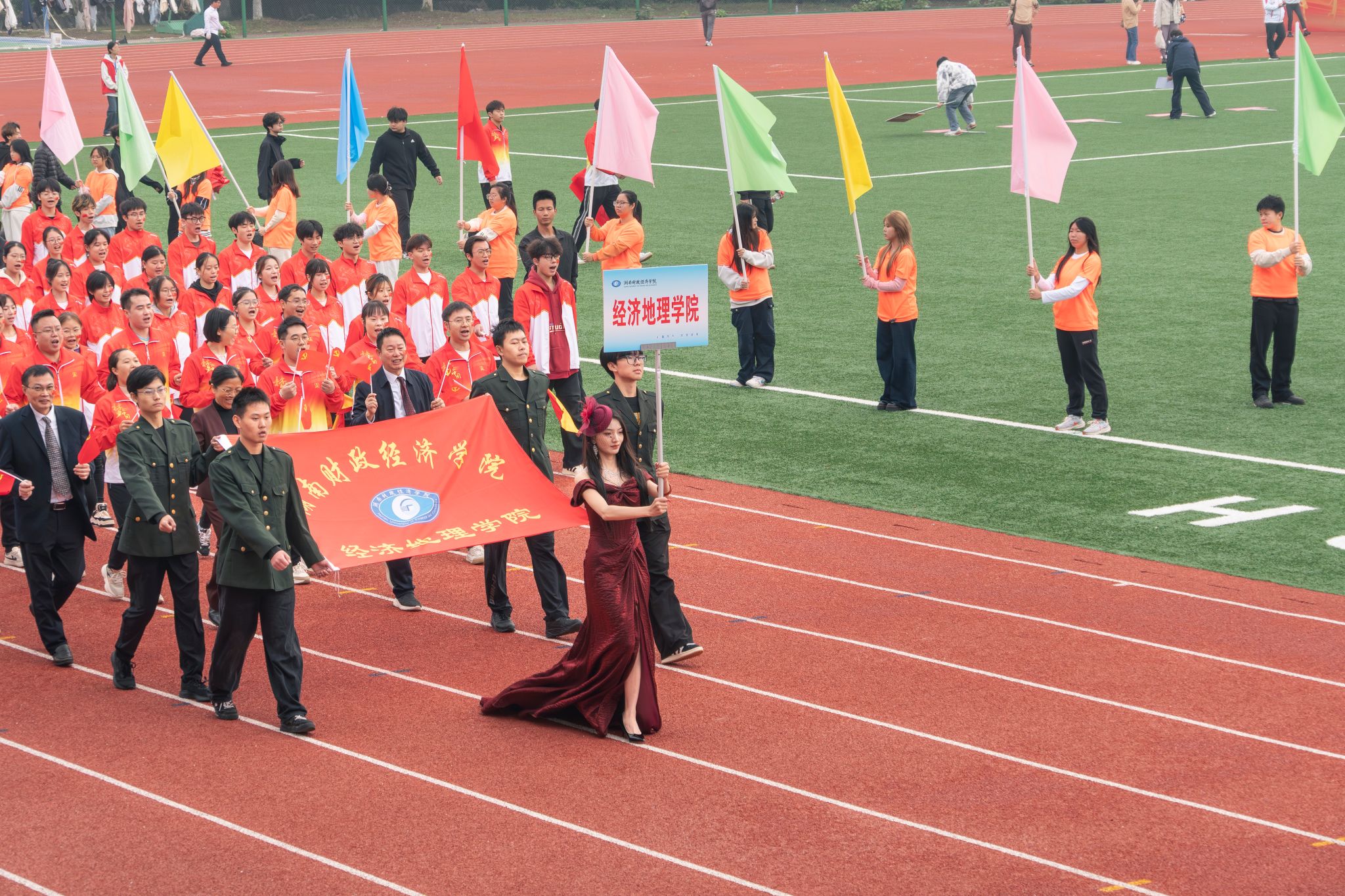 10月30日上午,院直属党支部书记姚旭辉、院长彭文斌和副院长苏昌贵带队出席开幕式。我院方阵以“民族团结+祖国统一”为主题,每一个细节都传递着维护国家主权和领土完整以及对祖国统一的热切期盼,为全校师生呈现了一场精彩绝伦的视觉盛宴,既彰显了地理学科“胸怀祖国、放眼山河”的专业特质,更传递出经地师生爱党爱国的赤子之心。