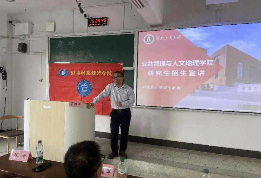 (本网讯)10月10日,经济学院在三教3202教室举办考研专题讲座。本次讲座邀请湖南工商大学公共管理与人文地理学院副院长罗湖平教授主讲,经济学院副院长陈雯主持讲座,就业专干孙文郁及2021、2022级有考研意愿的学生参加此次讲座。