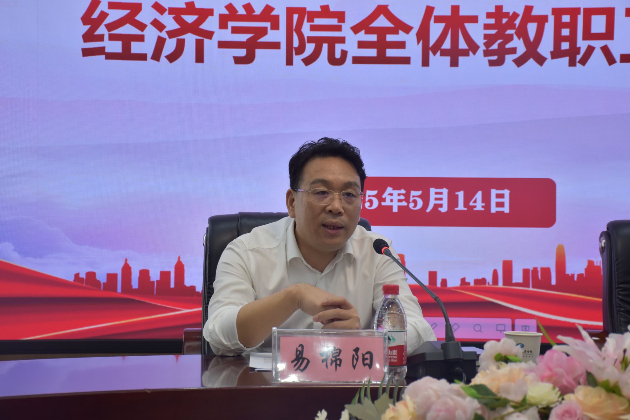 (本网讯)5月14日下午,经济学院在办公楼五楼视频会议室召开全体教职工大会暨师德师风建设专题会议。会议由学院院长李勇辉主持,校党委书记易棉阳出席会议并作专题报告,学院全体教职工参加会议。
