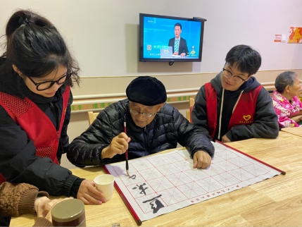 同时,志愿者们还准备了简单易学的小游戏——抢彩条。大家用心地和老人们讲解游戏规则和玩法,老人们清楚游戏规则后,很快地融入其中。会书法的老人还为志愿者展示了书法,有趣的互动为老人们的生活增添一份乐趣。