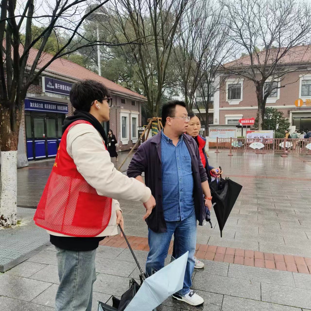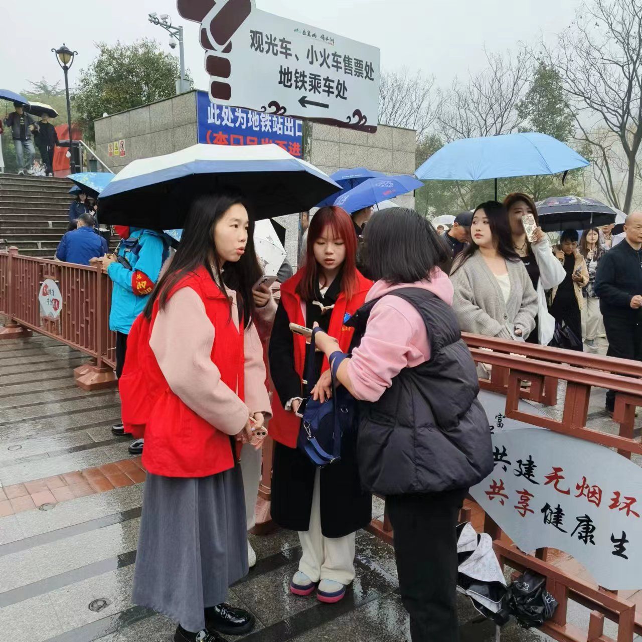 即使是在淅淅沥沥的小雨中志愿者们工作期间也没有一丝怨气,撑着伞时刻坚守在自己的工作岗位上。在志愿服务中,他们不仅要为游客指路,还要帮助维护交通秩序,更要为游客解答相关购票问题。但是他们从始至终都没有抱怨过,这便是雷锋精神最好的体现。