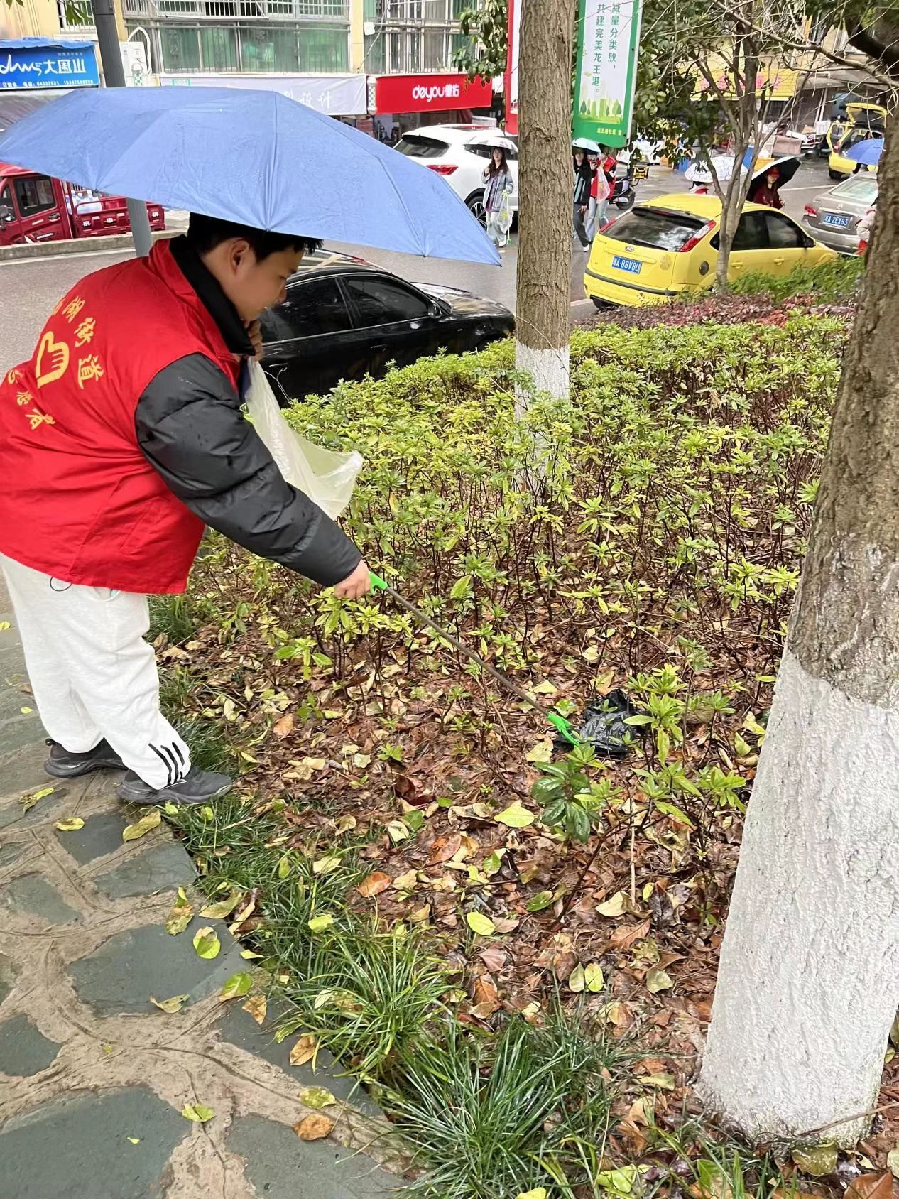 志愿者用清洁工具捡拾垃圾