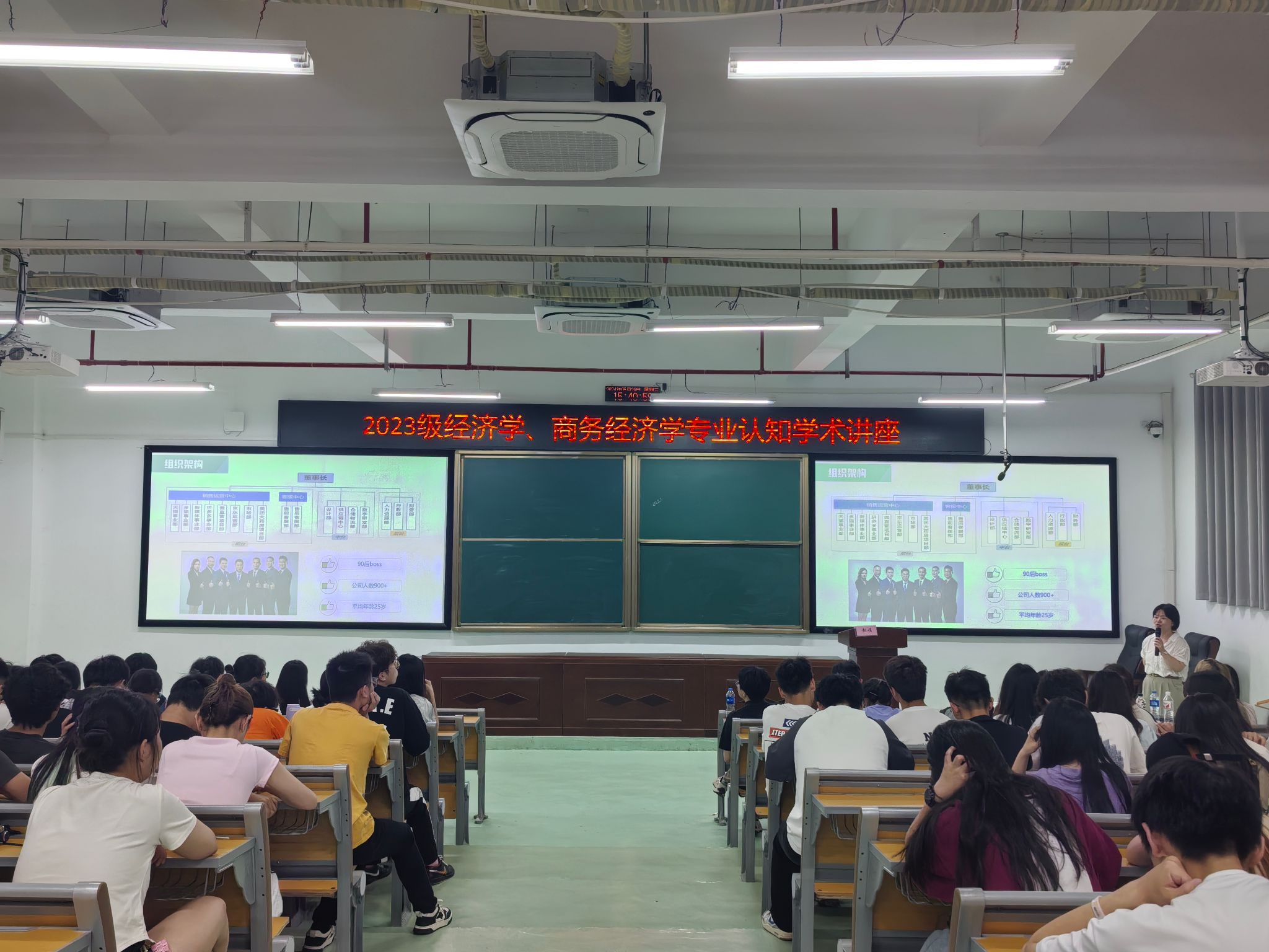 (本网讯)为帮助同学们提升专业认同、增进专业认知,寻找未来感兴趣的发展方向,5月29日下午,经济学院在雷锋校区L1115举办经济学、商务经济学专业认知学术讲座。讲座由鹏泽电商人力资源总监赵娟主讲,经济学系系主任杨芸、辅导员孙文郁及2023级经济学、商务经济学专业全体学生参加本次讲座,讲座由经济学系系主任杨芸主持。