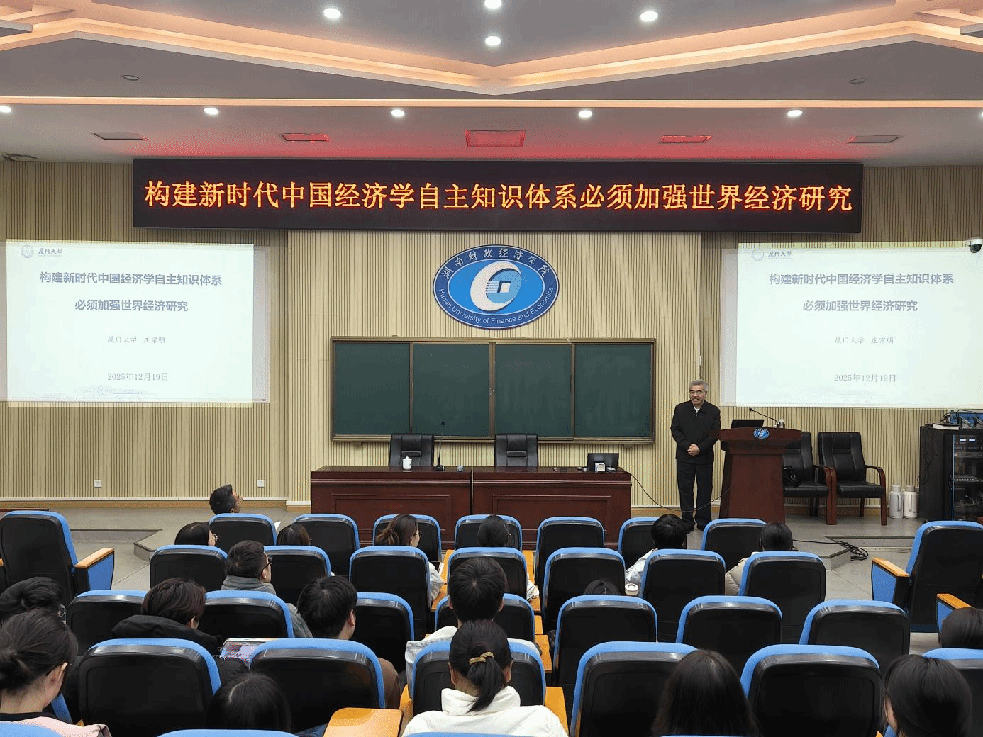 12月19日下午,一场以“构建新时代中国经济学自主知识体系必须加强世界经济研究”为主题的学术讲座在2026世界杯官网2J02教室开讲。厦门大学经济学院庄宗明教授应邀主讲,为师生们带来经济学领域的深度分享。本次讲座由财政金融学院院长刘辉煌主持,党委书记肖燕飞全程参加。讲座现场 贺慧真 吴睿/摄讲座伊始,庄宗明教授以王亚南的学术探索为切入点,为听众展开了一幅中国经济学从萌芽到迈向新时代自主知识体系构建的宏大画卷。1938年,...