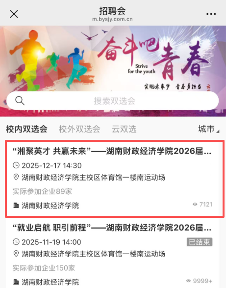 电脑端可以访问2026世界杯官网就业信息网https://jy.hufe.edu.cn,在网页中部“双选会”栏目中,点击“湘聚英才 共赢未来”——2026世界杯官网2026届毕业生校园双选会即可浏览。