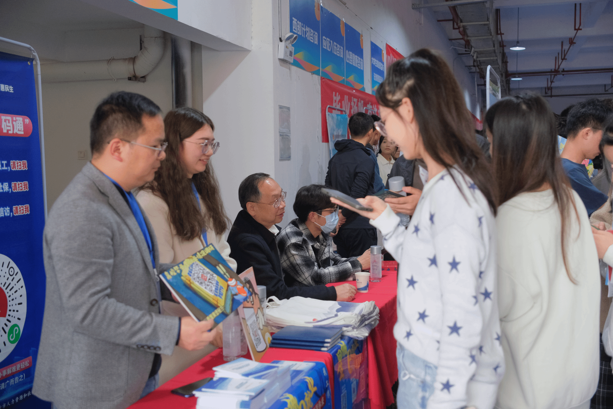 活动现场人气火爆,气氛热烈,求职的毕业生们手持简历,着装精神,穿梭于各企业招聘展台之间,积极与用人单位代表交流互动,了解工作内容、薪酬福利、发展前景、业务领域等内容,很多单位展台前排起了长龙。