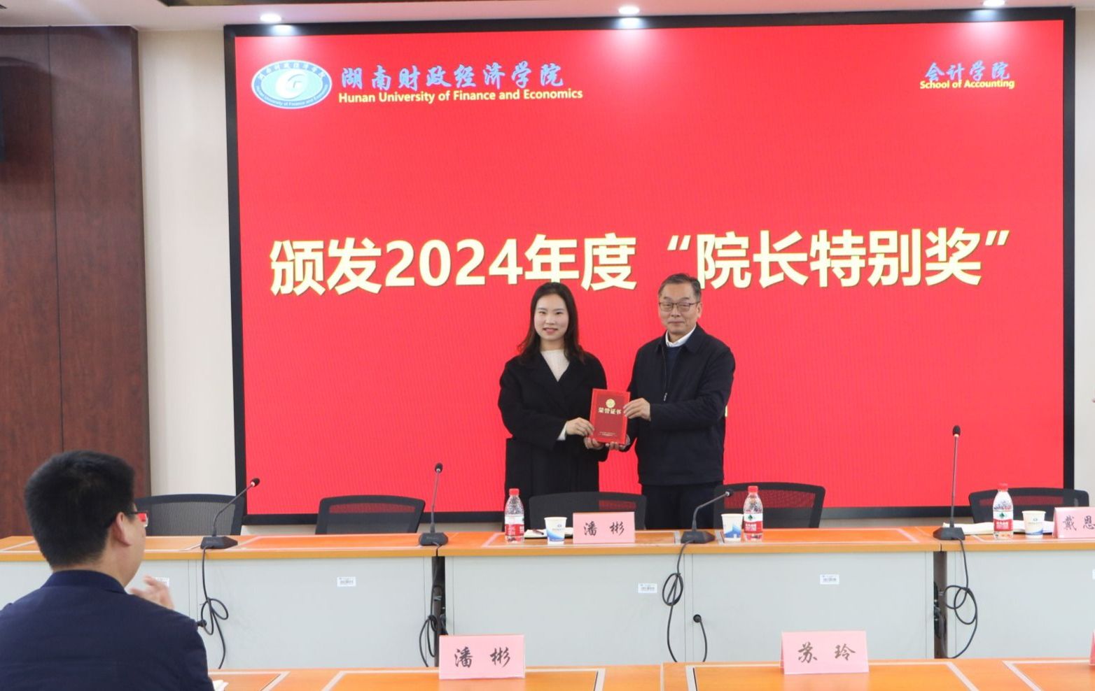 随后,学院党委书记戴恩湘宣布对学院优秀党支部和优秀系中心的表彰决定。同时,院长潘彬为谢素朴老师颁发“院长特别奖”,以表彰其在工作中的卓越表现和突出贡献。