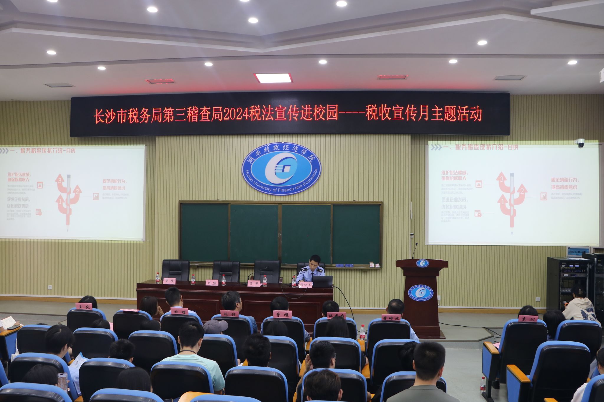 (本网讯)为深入学习贯彻习近平总书记考察湖南的重要讲话及重要指示批示精神,深入解读税收服务高质量发展新成效,大力推广便民办税新举措,积极构建税收普法新格局。4月26日下午15时,国家税务总局长沙市税务局第三稽查局来世界杯官网开展“税助发展,向新而行”主题税收宣传活动,出席本次活动的有国家税务总局长沙市税务局第三稽查局党委委员、副局长刘信、办公室主任曲植、稽查局干部代表、世界杯官网会计学院党委副书记肖芳、会计学院曾峻博士、财务管理系主任伍光磊、学院学生代表。本次活动由会计学院学生辅导员赵怡主持。