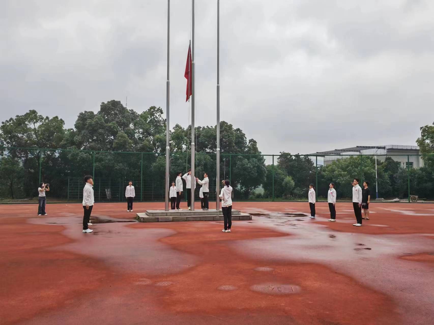 国旗护卫队迈着整齐的步伐走向升旗台。随着国歌的奏响,五星红旗冉冉升起,全体师生肃立致敬,目光紧随着国旗,心中充满了对祖国的热爱和敬意。
