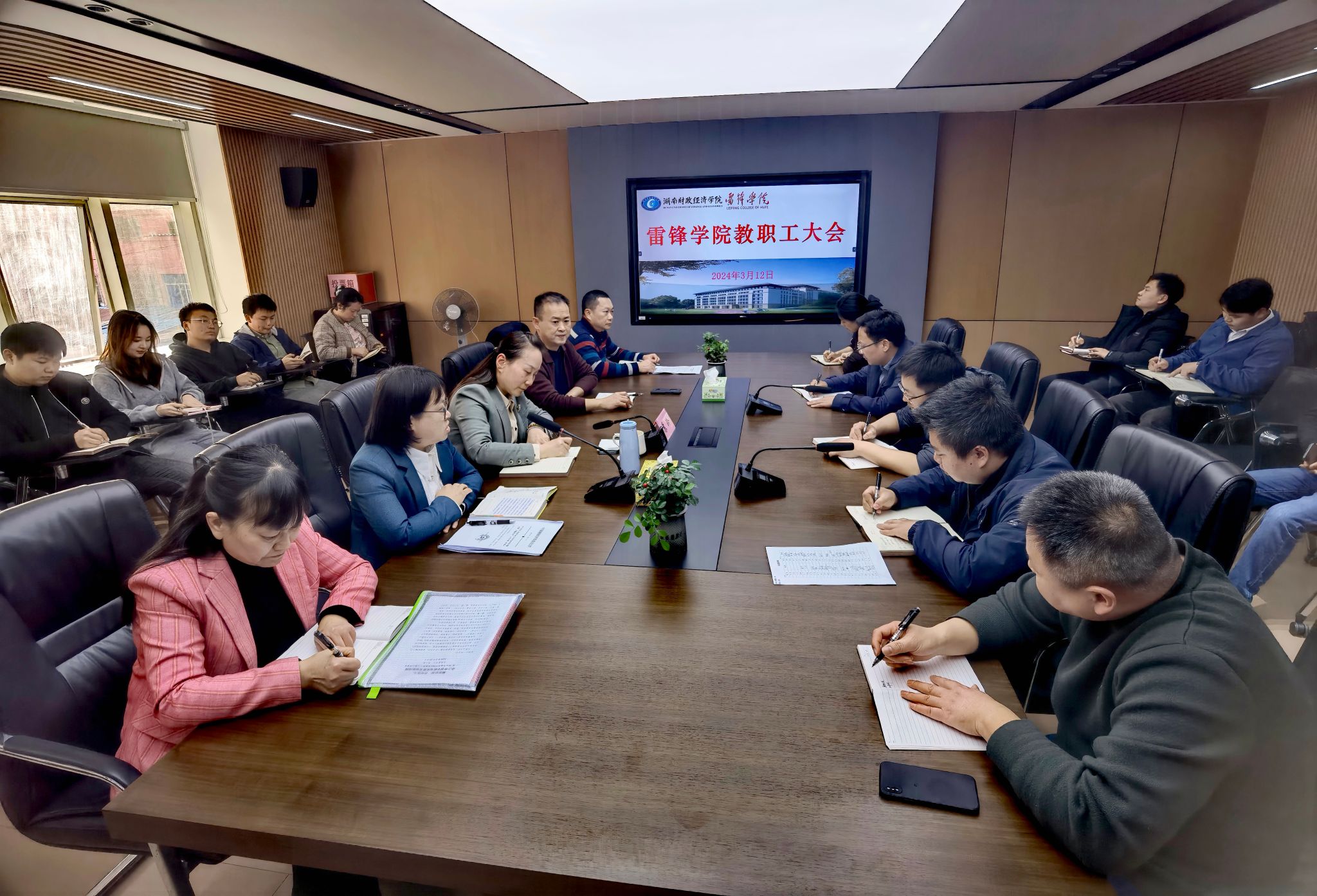 2024年3月12日下午,我院在行政楼205会议室召开教职工大会,并深入学习《2026世界杯官网推动高质量发展“质量建设年”工作方案》、《2026世界杯官网创建“五清校园”作风建设年工作方案》文件精神,会议由雷锋学院直属党支部刘东艳主持,校党委副书记苏玲出席会议,学院全体教职工参加会议。