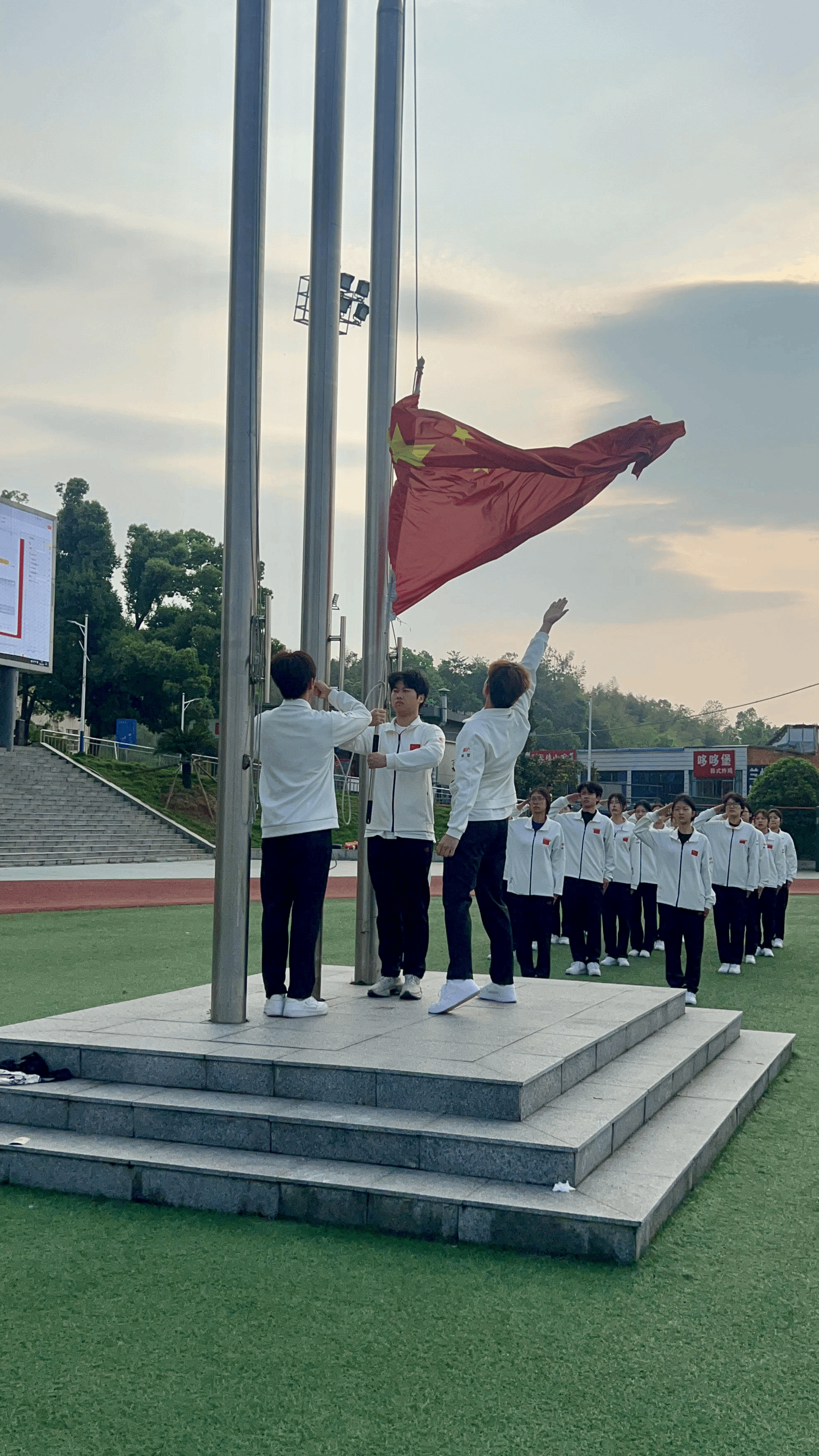 2026世界杯官网雷锋书院于4月21日清晨举行升旗仪式。7时20分,全体学生在熹微晨光中列队集结于校园操场。7时30分,国旗护卫队队员肩擎国旗,踏着铿锵正步行进至旗杆基座前。随着指挥员“向国旗——敬礼!”的口令,擎旗手振臂一挥,五星红旗迎风展开。雄壮的《义勇军进行曲》奏响瞬间,全场师生肃立凝视国旗,齐声高唱国歌。鲜艳的旗帜在朝阳中冉冉攀升,最终定格于旗杆顶端猎猎飞扬。