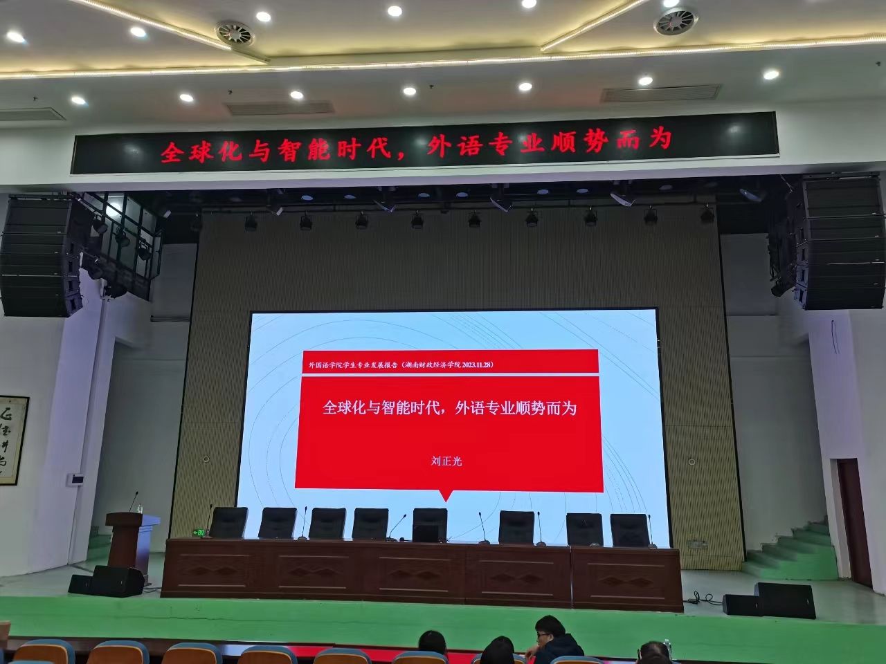 2023年11月29日晚上,外国语学院院长刘正光教授在雷锋学院L1114报告厅为同学们开展了一场主题为“全球化与智能时代,外语专业顺势而为”的学术讲座。