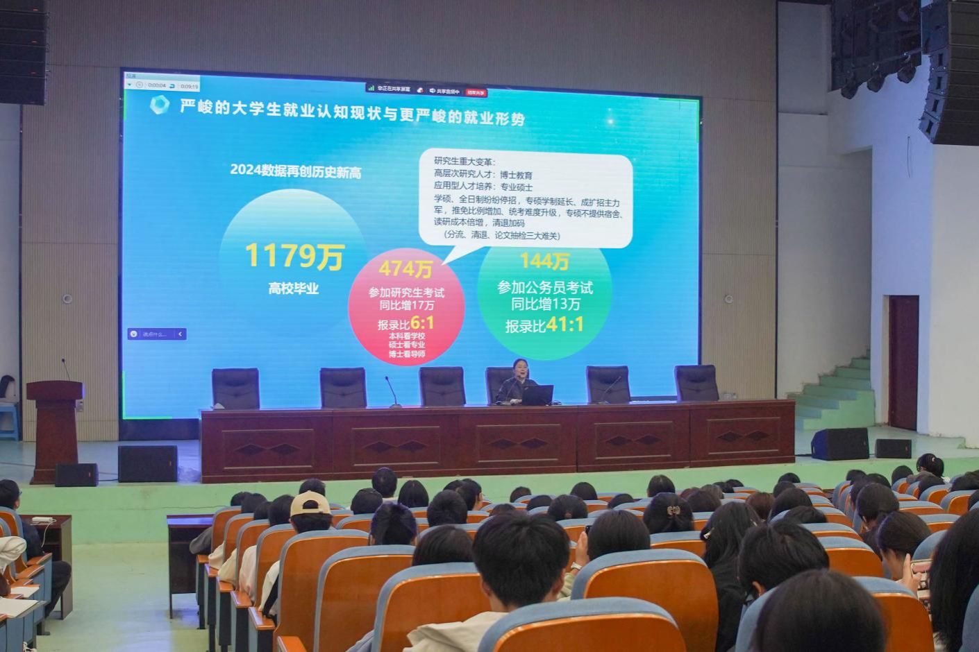 讲座开始,吴云用数据向大家分析了目前就业形势的严峻,由此指出了职业生涯规划大赛的意义所在。这不仅让大家了解了大学生面临的就业现状,也提高了同学们对职业生涯规划大赛的兴趣。