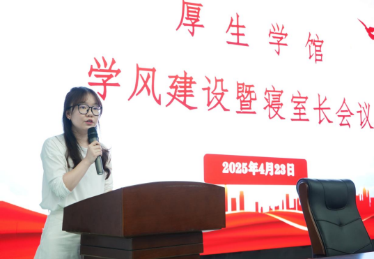 为进一步加强厚生学馆的学风建设,优化学生宿舍管理,营造文明和谐的校园氛围,4月23日16:30,厚生学馆在雷锋书院L1114举行学风建设暨寝室长会议。雷锋书院直属党支部书记余新明、副书记黎红梅、袁冶,厚生学馆学工办主任朱颖、全体辅导员及600余名2024级厚生学子、寝室长参加本次活动,会议由朱颖主持。