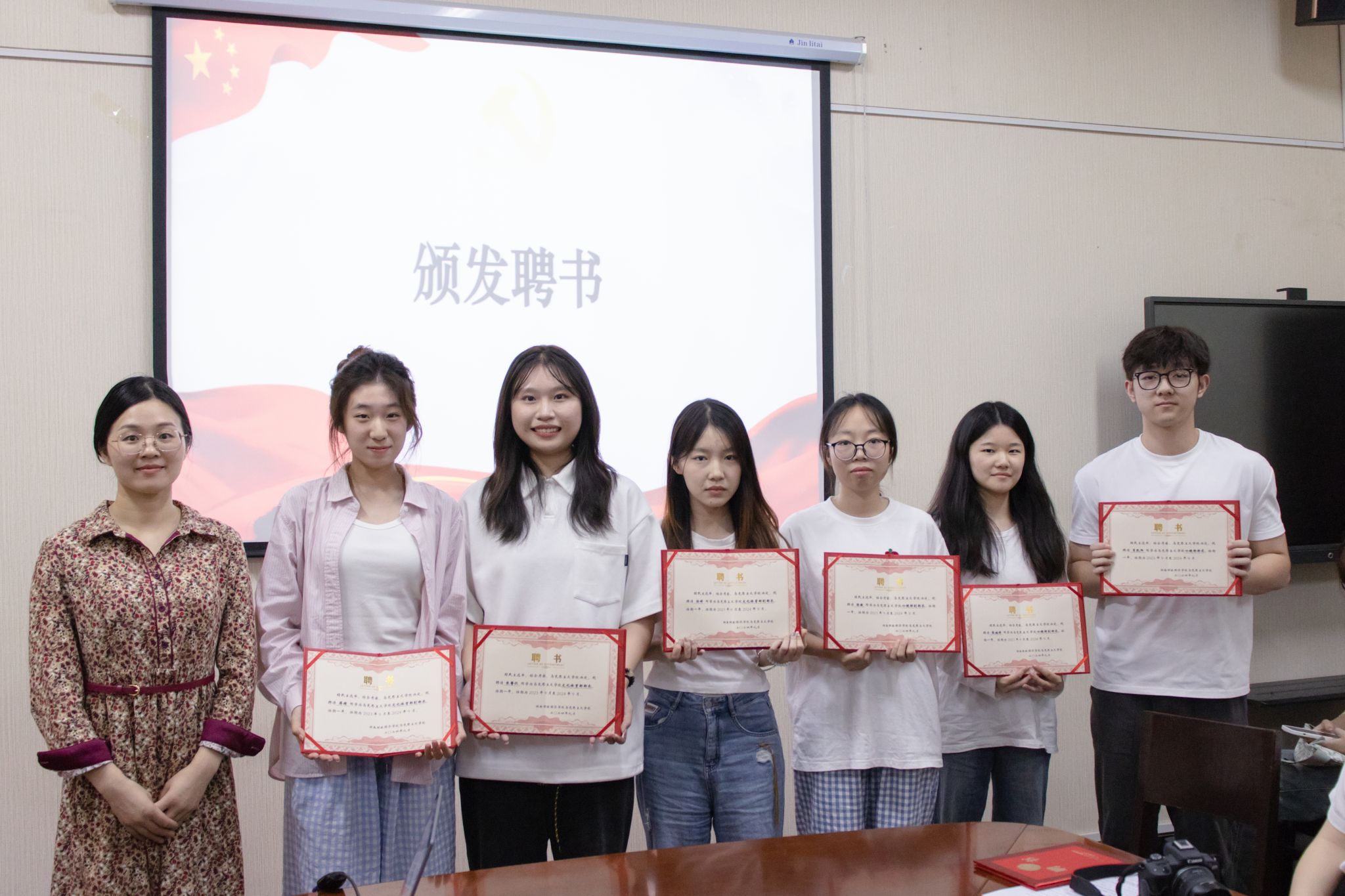 周雄艳为上一届团学会主要干部颁布聘书并合影留恋。