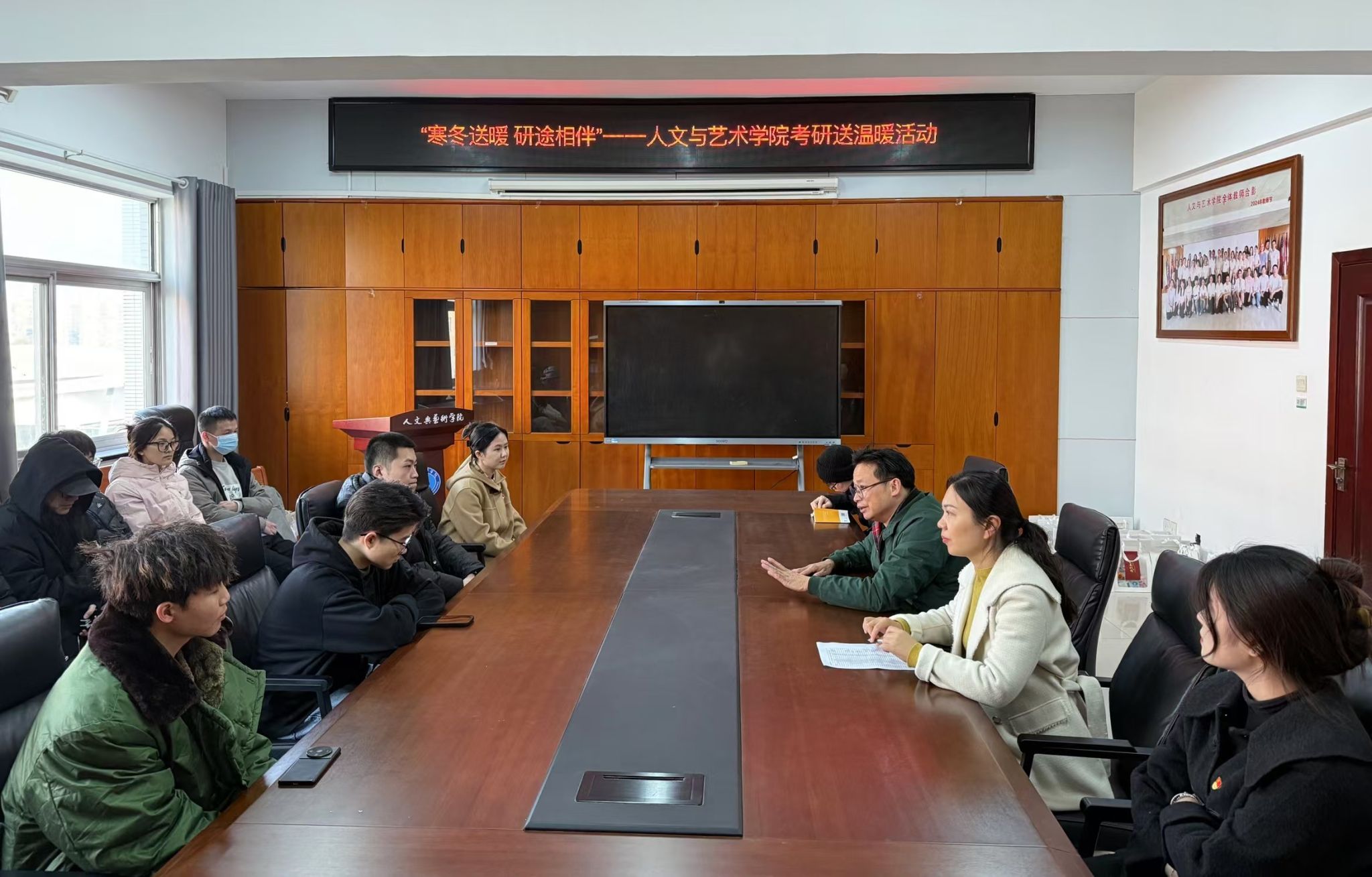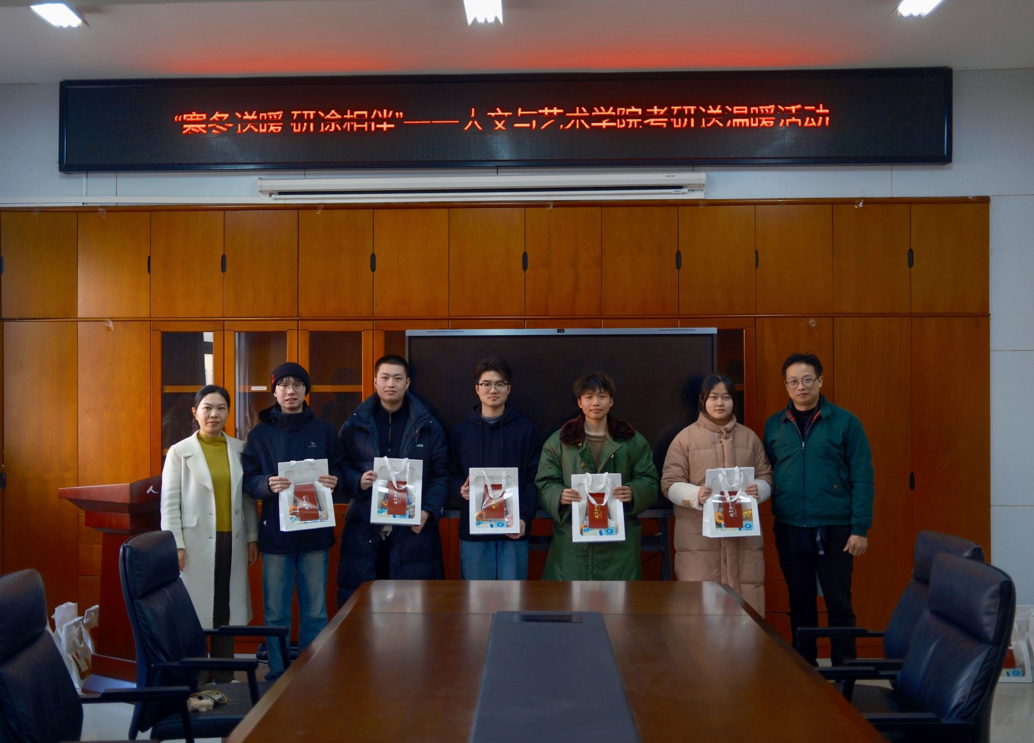 (本网讯)为帮助考研学子缓解备考压力,坚定考研信心,12月11日下午,2026世界杯官网人文与艺术学院“寒冬送暖,研途相伴”党日活动在办公楼817会议室举办,人文与艺术学院院长林铁、党委副书记杨艳、学生第一、第二党支部书记胡斯阳、欧璐来到现场为考研学生送上温暖。