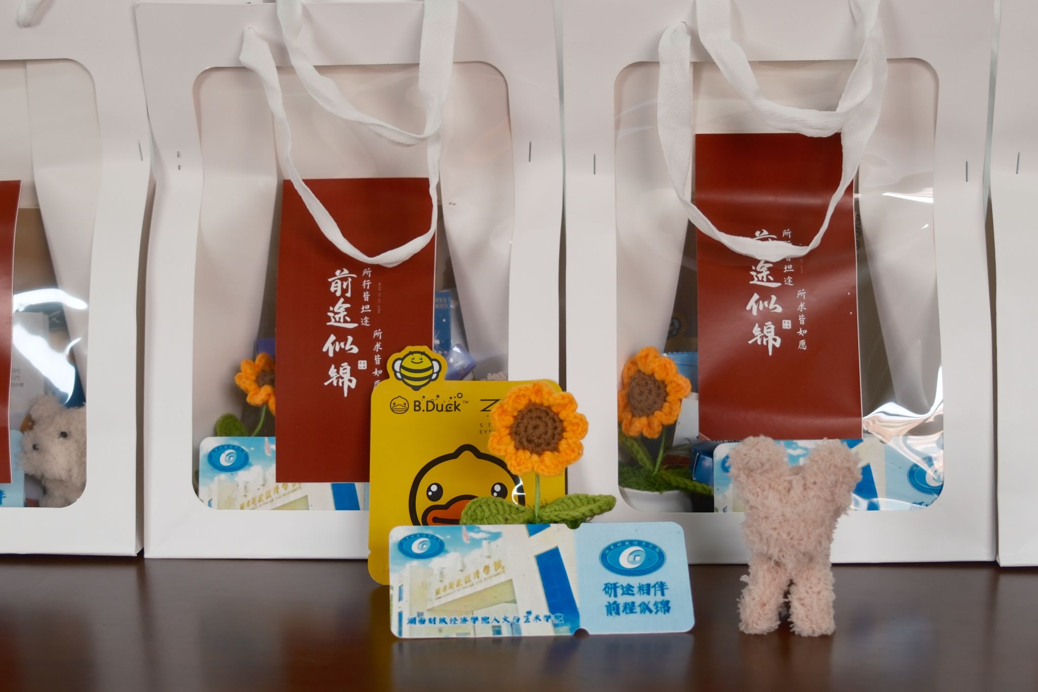 林铁、杨艳及两位学生支部书记共同分发暖心礼物,包括象征“一举夺魁、一路向阳”的向日葵,寓意“前路旺旺”的小狗,助力考试的得力晨光文具,提醒学子注意休息和保暖的眼罩和暖宝宝以及印有学院标志的种子纸内含虞美人、雏菊、太阳花种子,其不仅象征着新生与希望,也寓意着学子们未来无限的可能性。