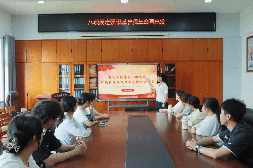 会上,欧璐以“八项规定:青年党员的‘成长必修课’”为题,系统解读中央八项规定精神的核心要义,结合高校学生党员实际,从“改进调查研究”“精简会议活动”“厉行勤俭节约”等八个方面展开剖析。她强调,八项规定不仅是作风建设的“铁规矩”,更是青年党员践行初心使命的“必修课”,要求党员杜绝“指尖形式主义”“人情消费攀比”等易发问题,以严实作风树立学生党员先锋形象,警示学生党员“作风问题无小事,一念之差毁前程”。