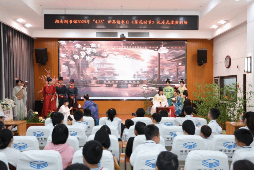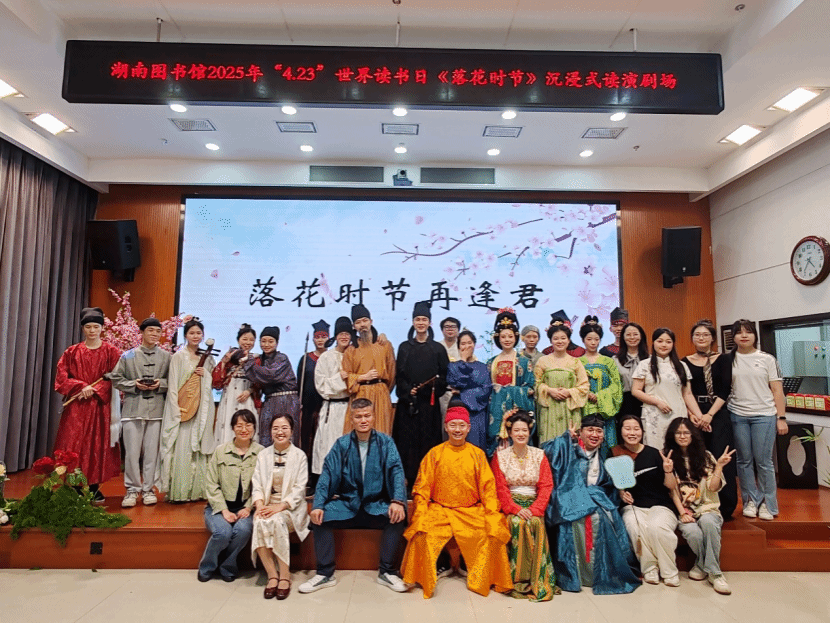 (本网讯)4月19日,世界杯官网人文与艺术学院师生联袂创作的读演剧目《落花时节》在湖南省图书馆多媒体演示厅精彩亮相。作为湖南省图书馆“4.23”世界读书日暨公共图书馆服务宣传周系列活动子项目之一,该剧以跨文体、跨媒介形式,带领观众沉浸式感受古典诗词的魅力,开启一场穿越时空的诗词文化之旅。