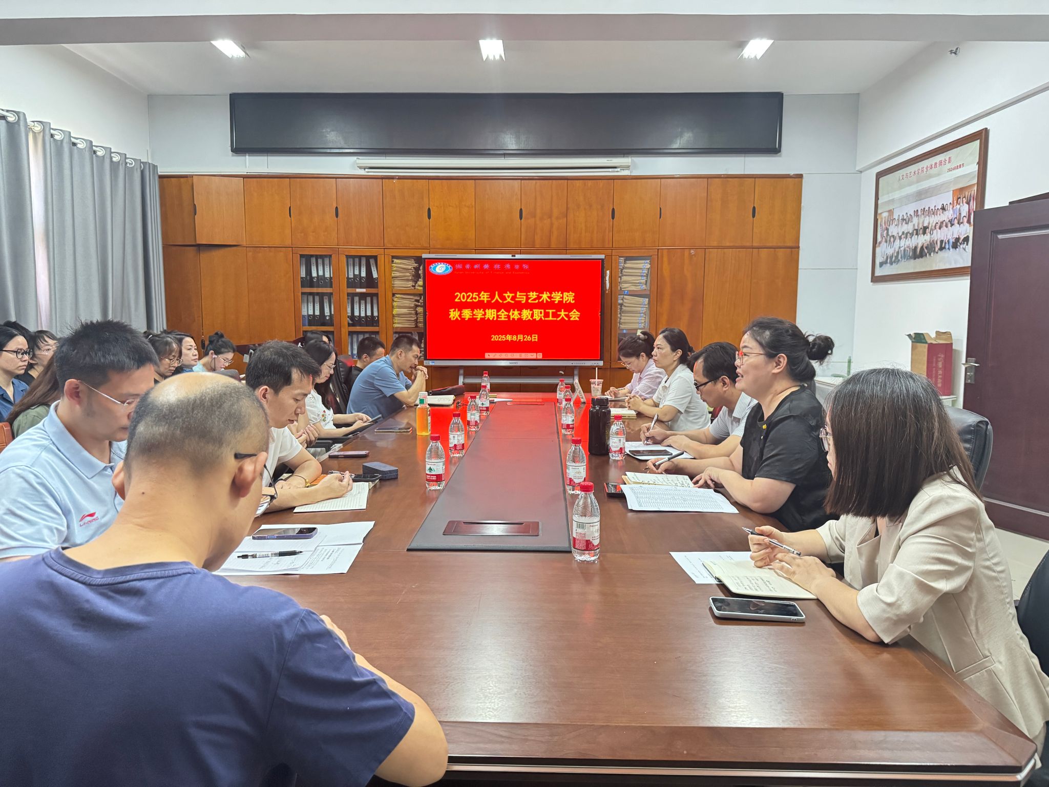 (本网讯)8月26日下午,人文与艺术学院在817会议室召开2025年下学期全体教职工大会。学院领导班子及全体教职工齐聚一堂,共商新学期发展大计。会议由院长林铁主持。 会上,林铁传达了易棉阳书记在学校暑期办学思想大讨论上的重要讲话精神,深入分析了学院在学科建设、专业优化、人才引育等方面面临的机遇与挑战。他要求全体教职员工进一步提高站位,以高度的责任感和主人翁精神主动融入学校“新文科”建设大局,在新学期跑出“...