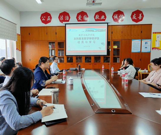 2024年4月25日下午,数学与统计学院在办公楼809会议室召开本科教育教学审核评估学习动员大会,会议由党总支书记王萱主持,全院教职工参加 。