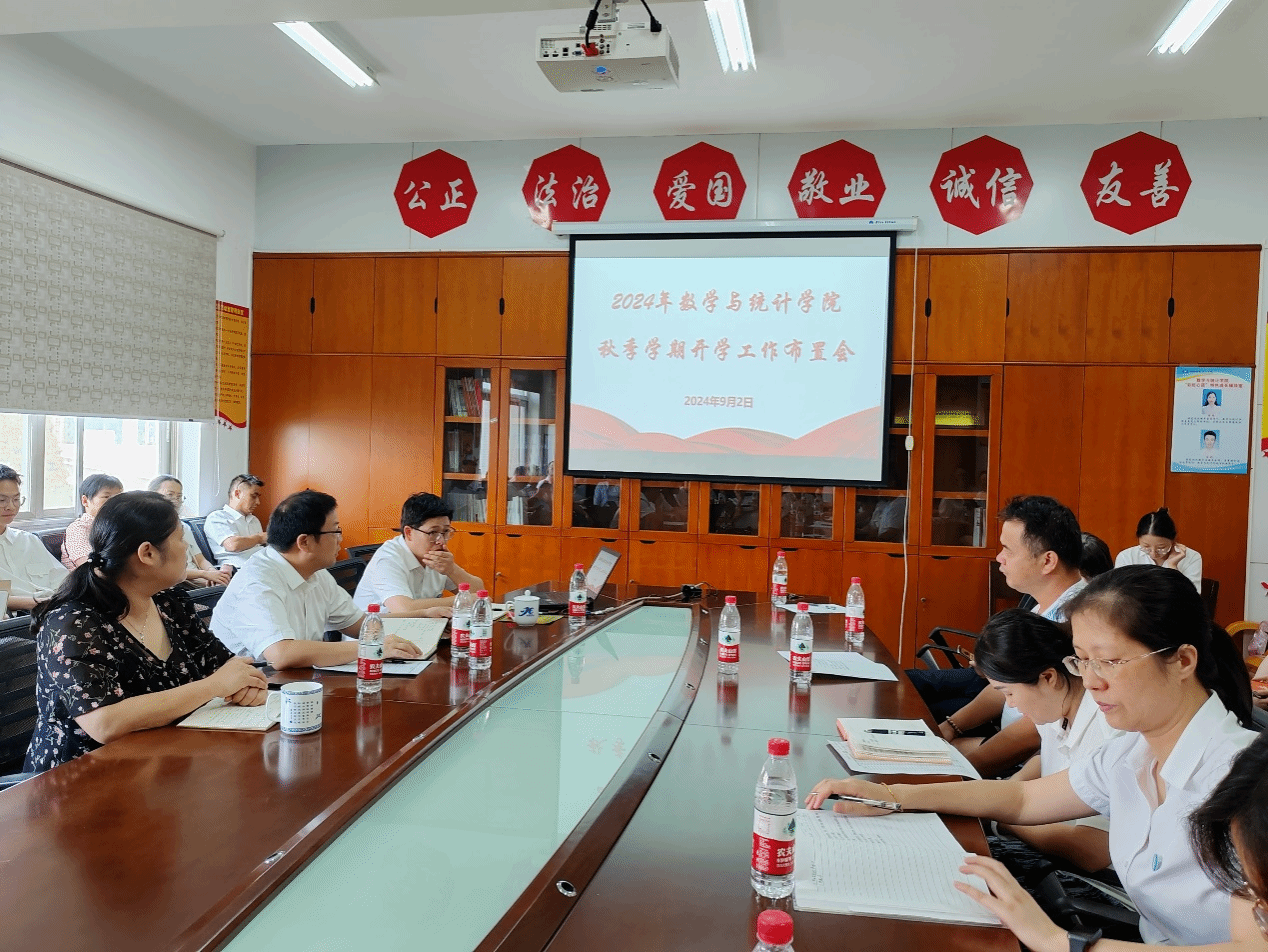 2024年9月2日下午,数学与统计学院在办公楼809会议室召开全院教职工大会,学院领导班子及全体教职员工参加,会议由学院院长尹向飞主持。学院院长尹向飞在会上介绍了新入职的老师,并就本学期科研工作进行了安排,希望全院教职工积极参与科研及学科建设,努力提高自身科研水平。他强调要高度重视教学工作,积极开展教学研讨,为明年的审核评估工作做好准备。会议现场学院副院长吕胜祥向在座教职工汇报了学院暑期以来完成的各项任务,...