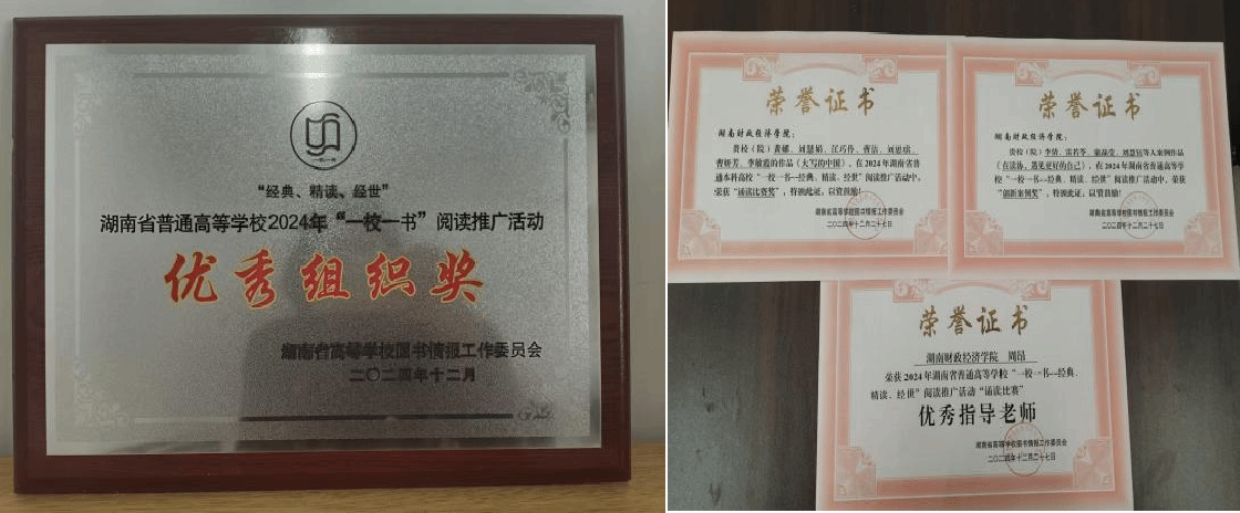 此外,世界杯官网图书馆荣获2024年度湖南省高校图工委“优秀组织奖”。图书馆读者协会提交的案例《在读协,遇见更好的自己》荣获“创新案例奖”;由周昂老师指导的诵读作品《大写的中国》荣获诵读比赛奖。