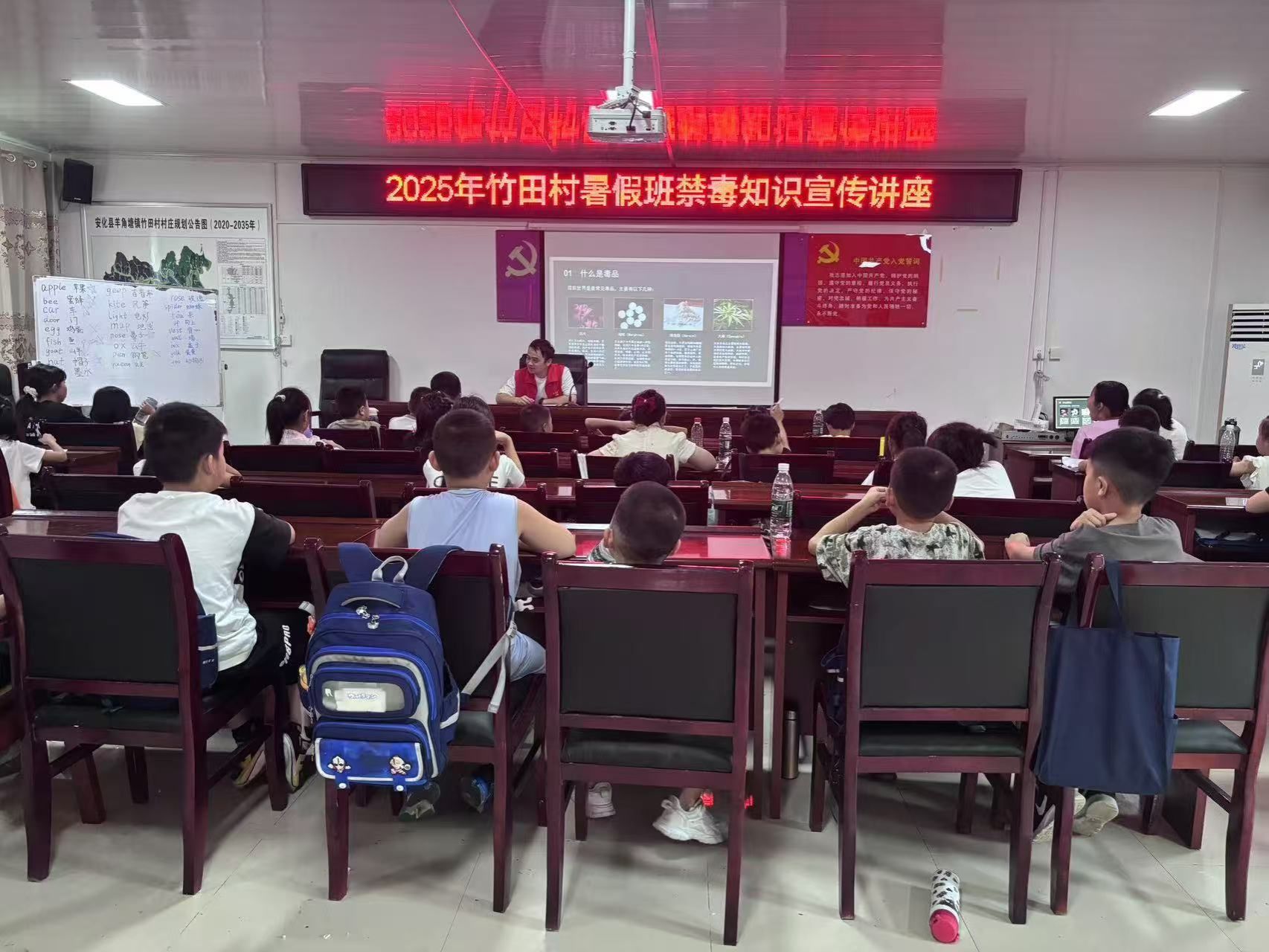 为深化乡村法治教育,护航青少年健康成长,7月21日,“筑梦支教队”联合羊角塘镇平安法治、应急管理办及竹田村村委,在竹田村共同组织了一场青少年禁毒知识专题讲座。此次活动得到了村委干部、支教队员与村民家长们的倾力支持与积极参与,累计服务数量近百人次。本次活动提高了青少年识毒、防毒、拒毒意识,生动展现了基层治理与教育帮扶的深度融合。