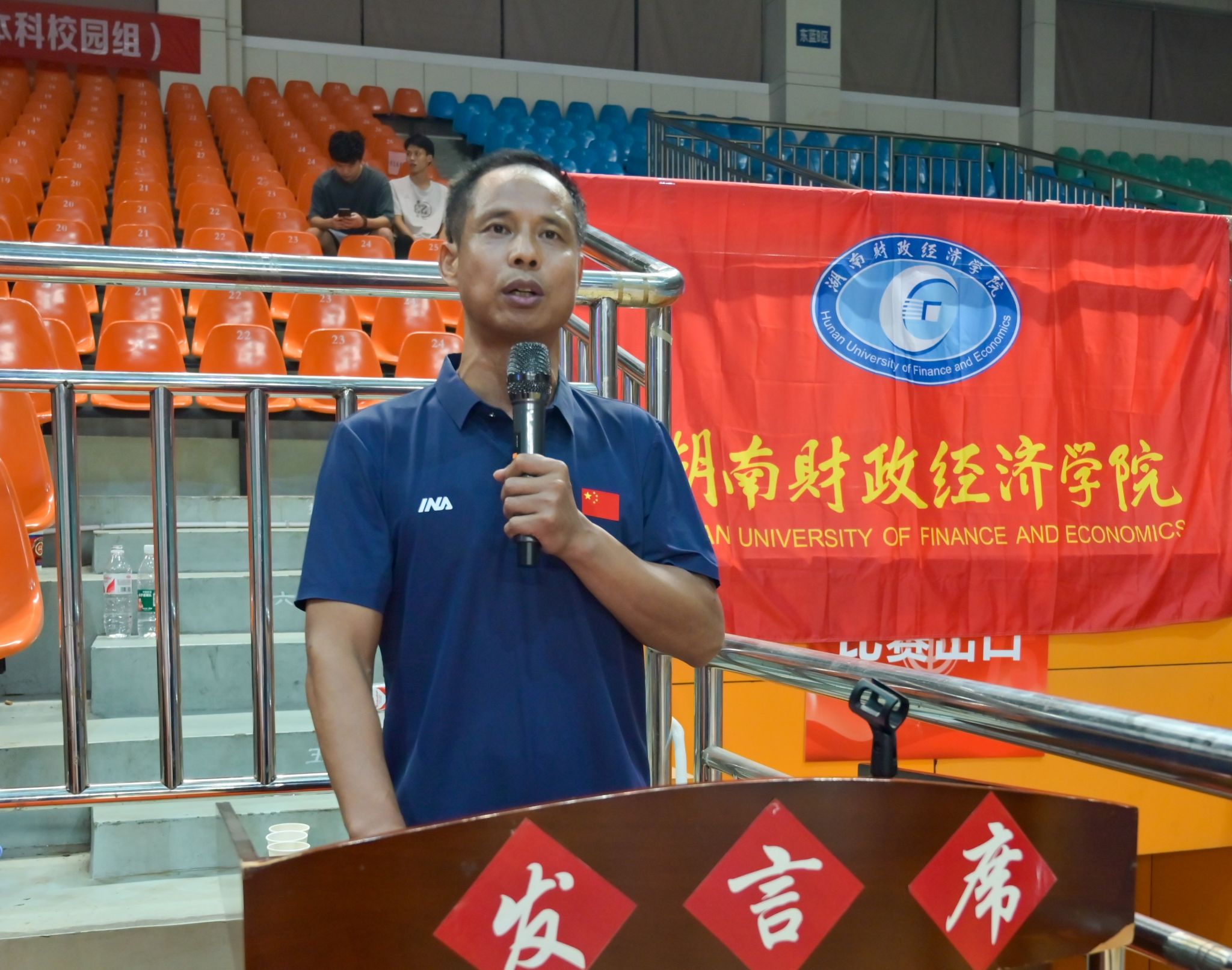 随后,湖南省教育厅体育卫生与艺术教育处二级调研员傅联红致开幕词。他代表湖南省教育厅对本次比赛的举办表示诚挚祝贺,对各代表队人员表示热烈欢迎,并向关心支持我省学校体育事业发展的各界人士致谢。傅联红指出,体育在人全面发展中具有基础性作用,我省学校体育事业在各方努力下取得长足进步,包括课程建设、场馆设施、阳光体育开展以及竞技水平提升等多方面成果显著且在全国名列前茅。举办本次大学生篮球联赛是加强青年体育锻炼、增强体质的重要举措,有助于在高校营造浓郁体育氛围,提高学生体质健康水平。他还以自己热爱篮球为例,鼓励同学们积极参与篮球运动并带动身边人,让更多年轻人投身体育运动。