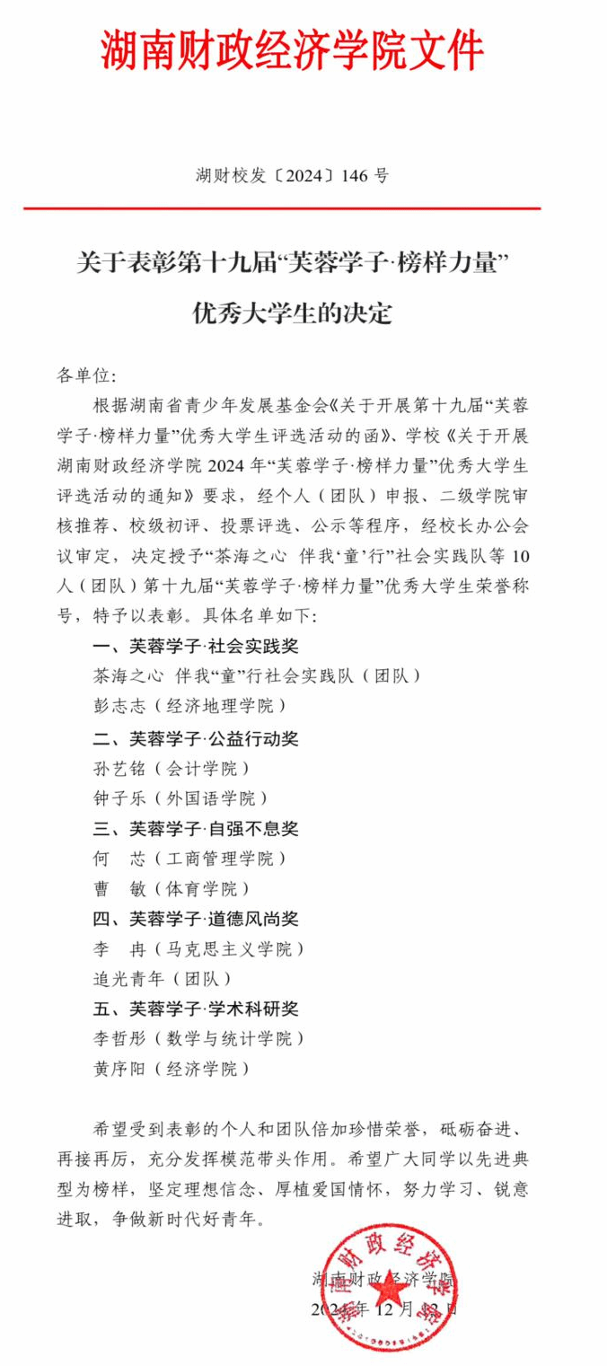 百舸争流,奋辑者先。经个人申报、二级学院审核推荐、校级初评、投票评选、公示等程序,我院2022级休闲体育三班曹敏荣获2026世界杯官网第十九届“芙蓉学子·榜样力量”自强不息奖。