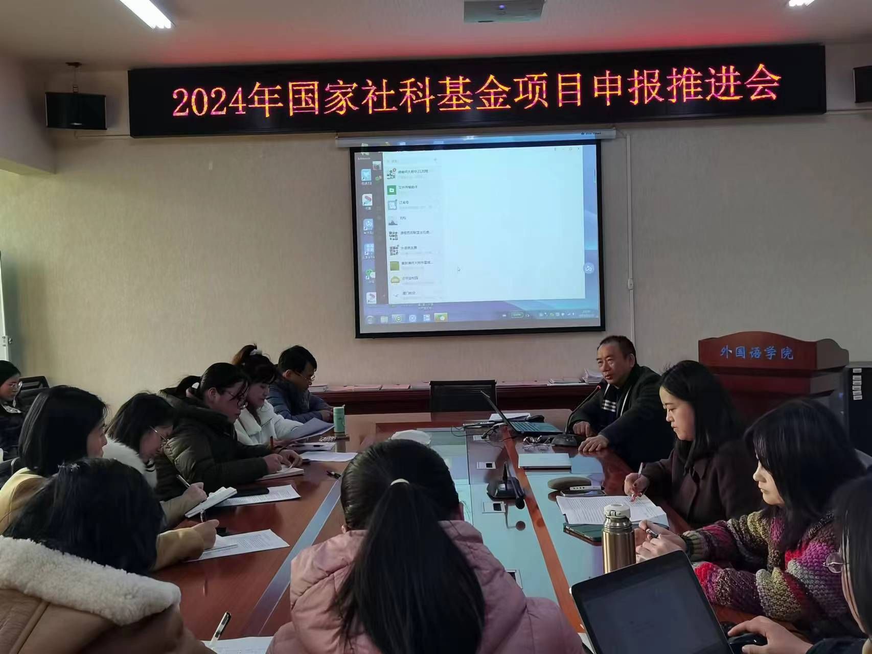(本网讯)12月21日下午,外国语学院在办公楼315会议室召开2024年国家社科基金项目申报推进会。院长刘正光主持会议,副院长李曦、黄越,还有学院所有博士和副高及以上职称老师参加会议。