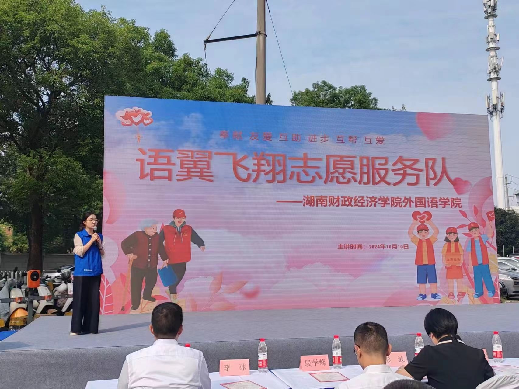 (本网讯)为扎实推进“五社联动 幸福邻里”工作走深做实,促进慈善与社工服务高质量融合发展,10月10日上午,西大门社区在向日葵广场举办了“五社联动凝善行,心沐暖阳乐邻里”慈社融合宣传活动。本次活动由长沙市民政局、湘江新区民政和社会保障局、湘江新区咸嘉湖街道工委指导,咸嘉湖街道西大门社区居民委员会主办。外国语学院作为共建单位受邀参与此次活动,学院党委书记凌飞、副院长汪小英、副书记张鹏以及行政党支部全体党员和16名语翼飞翔志愿服务队成员一同参与。