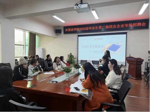 (本网讯)12月18日下午,外国语学院2026届毕业生第二场校友企业专场招聘会在学院会议室顺利举行。本次招聘会邀请了东莞在一起电子商务有限公司、良师教育集团等优质企业回校“招贤纳士”,旨在为毕业生搭建与企业直接对接的桥梁,促进毕业生高质量就业。学院党委书记凌飞、党委副书记张鹏、学工办主任肖叶枝及毕业班辅导员杨舒淇、胡文志出席活动,近50名2026届毕业生参与求职应聘。