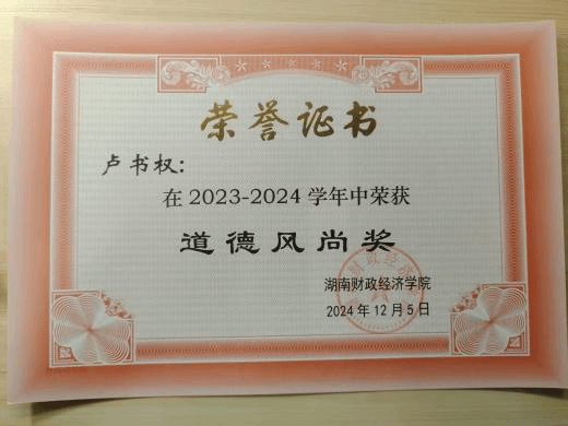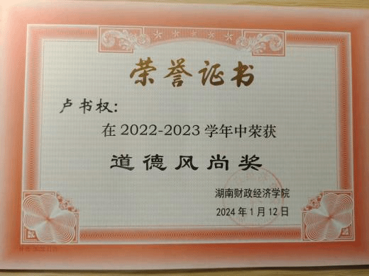 课余实践中,我积极参与文体活动,在2022年湖南省中华经典诵写讲大赛中获得本科生组三等奖、在“雷锋新秀”才艺大赛中荣获二等奖。此外,作为寝室长带领寝室获得“平安寝室”一等奖、“星级寝室”等荣誉,在不同领域不断提升自我。