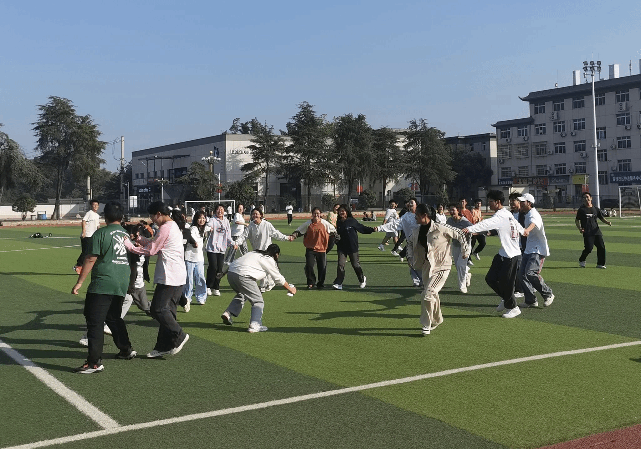 以体强心,探索“体育+心育”新模式。通过结合体育运动与心理学实验,开展内容丰富、形式多样,集趣味性、参与性为一体的运动项目,除第九套广播体操外,还设置了“持球替换接力”“扶杆接力”“叫号出击”“保护膝盖”“单脚独臂抗争”等趣味性较高的体育游戏运动项目,更引入了AI运动项目,包括开合跑、深蹲、高抬腿和跳绳等,探索有助于大学生身心健康的新模式。